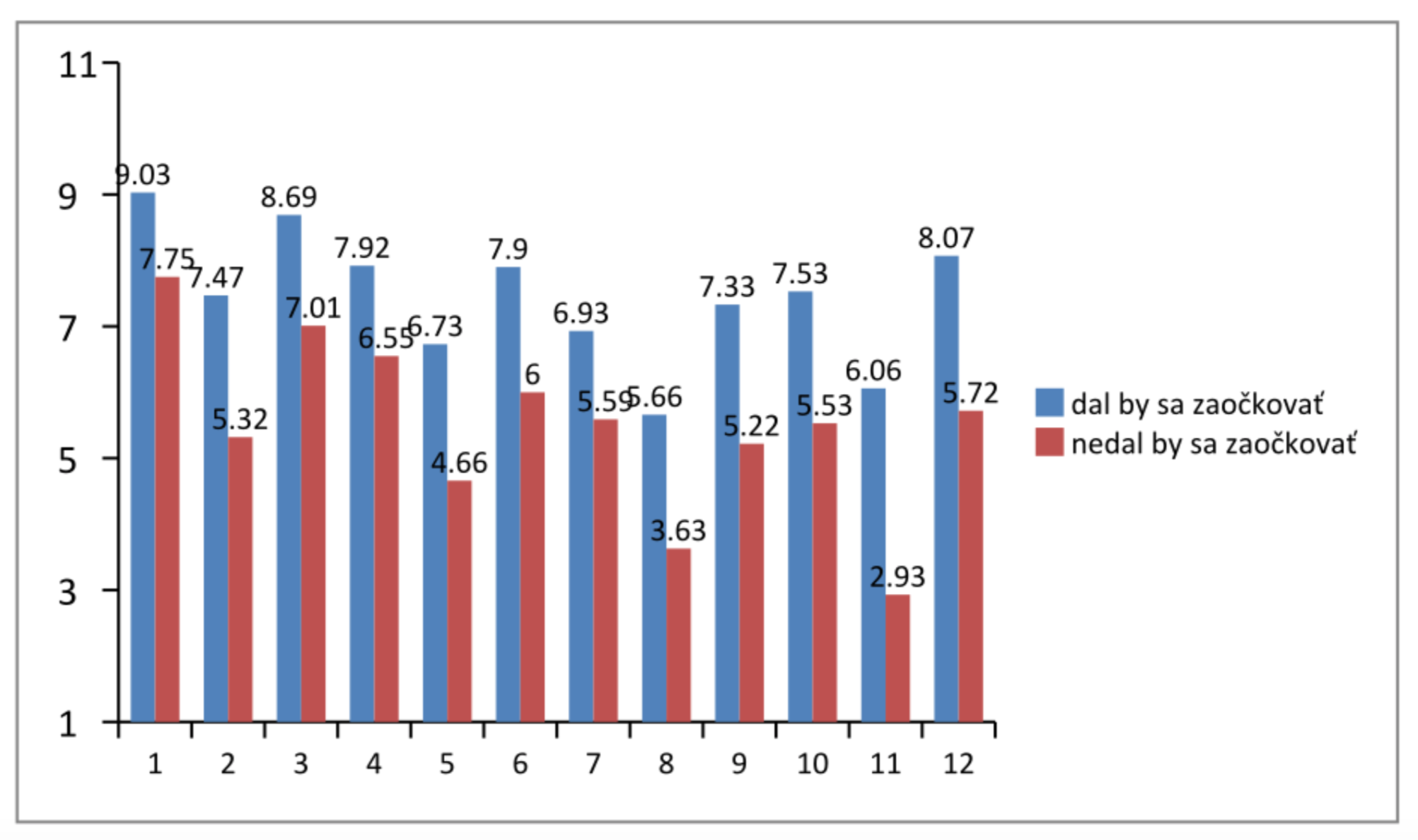 Takto vyzerá priemer dôvery v jednotlivé inštitúcie podľa ochoty dať sa zaočkovať proti koronavírusu. Na škále od 1 = vôbec nedôverujem až 11 = veľmi dôverujem.