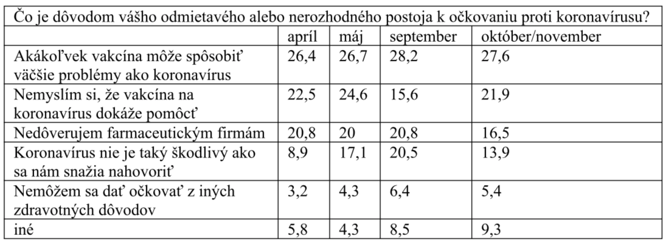 Najvýraznejšie v súvislosti s odmietaním očkovania kleslo oproti septembru uvádzanie dôvodu „Koronavírus nie je taký škodlivý ako sa nám snažia nahovoriť“, čo pravdepodobne súvisí s rastúcim počtom hospitalizácií a úmrtí.