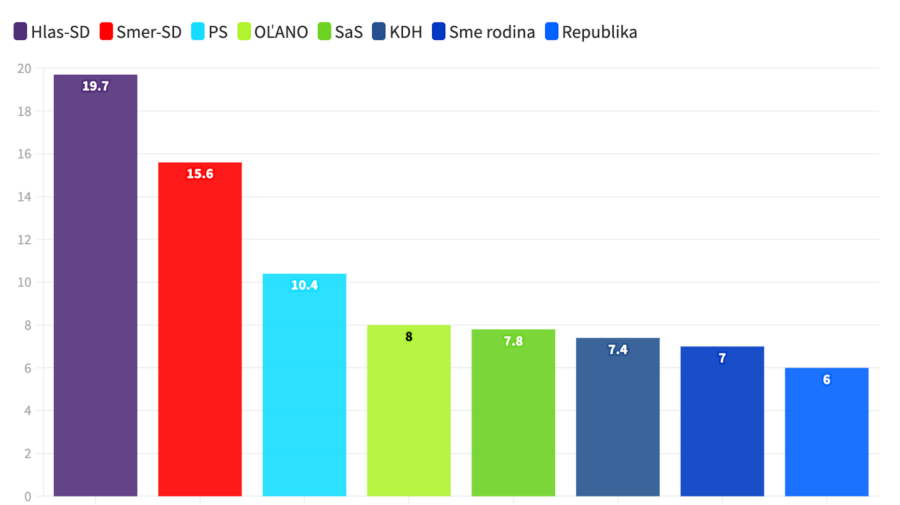 Štvrté v poradí by skončilo hnutie OĽANO (8 percent), za ním by nasledovala SaS (7,8 percenta). Do parlamentu by sa dostali aj KDH (7,4 percenta), Sme rodina (7 percent) a Republika (6 percent).