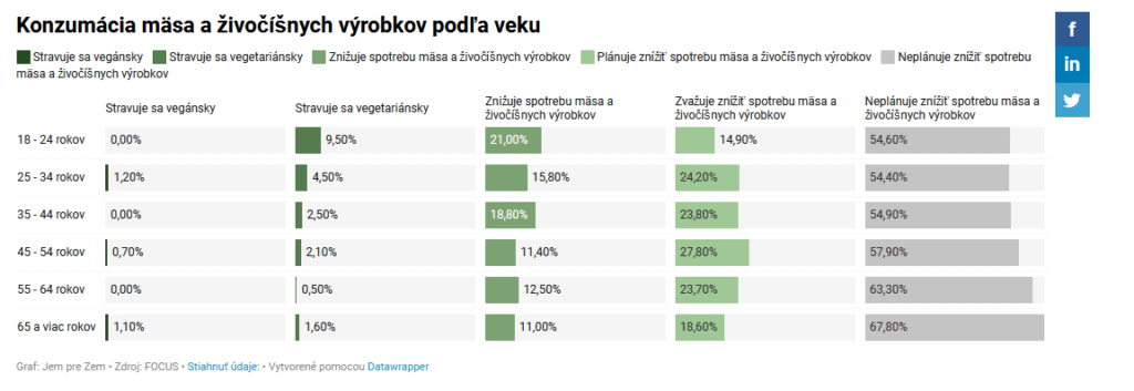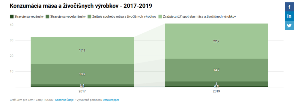 Slováci chcú žiť zdravšie a ekologickejšie, potvrdil to prieskum agentúry Focus z decembra minulého roka realizovaný na vzorke 1008 respondentov a respondentiek . Štyria z desiatich respondentov znižujú alebo zvažujú znižovanie svojej spotreby mäsa a živočíšnych výrobkov, ako sú mlieko, syry či vajcia. Rovnaký podiel v minulom roku nakupoval rastlinné alternatívy mäsa, syrov a mliečnych výrobkov.
