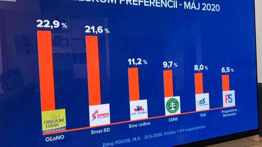 • Voľby by aj v polovici mája vyhralo OĽaNO, ktoré by volilo 22,9 percenta respondentov, Smeru-SD by svoj hlas odovzdalo 21,6 percenta voličov a na treťom mieste sa umiestnilo hnutie Sme rodina so ziskom 11,2 percenta