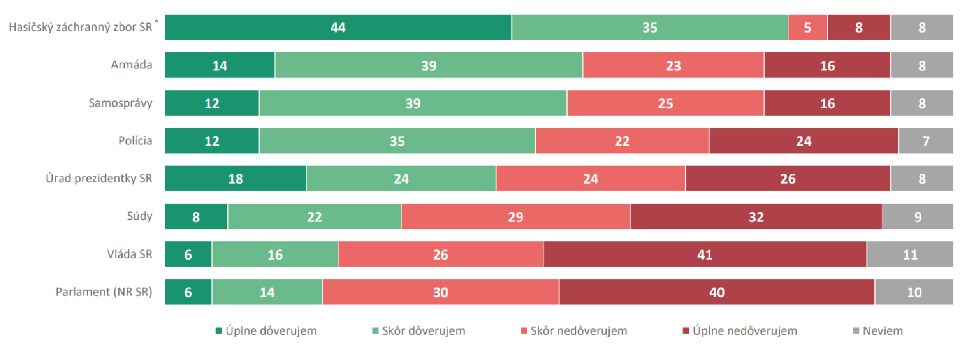 Slováci sú skôr nedôverčiví aj voči národným inštitúciám. Najdôveryhodnejšou národnou inštitúciou medzi obyvateľmi je Hasičský a záchranný zbor SR. Dôveru mu deklaruje 79 % obyvateľov. Nasledujú armáda, samosprávy a polícia. Armáde deklarujú dôveru najmä ľudia vo veku 40 – 59 rokov.