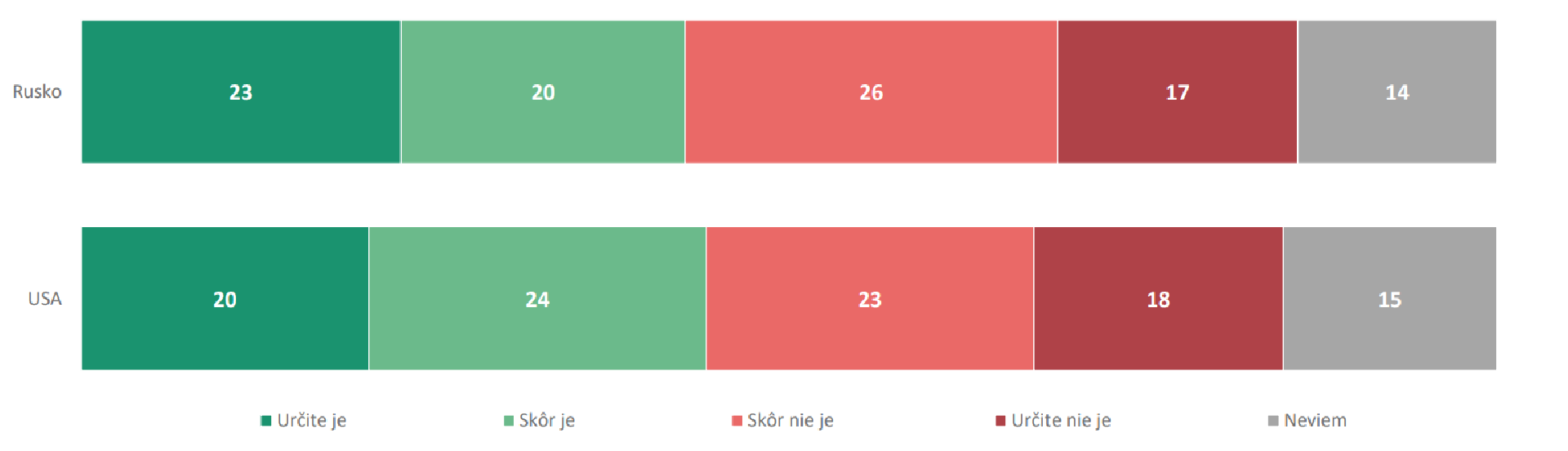 Ďalším bodom prieskumu je vnímanie USA a Ruska Slovákmi. Podľa prieskumu považuje 43 % dospelých obyvateľov Slovenskej republiky Rusko za hrozbu, pričom takmer rovnaký podiel, 44 %, považuje za hrozbu aj Spojené štáty.