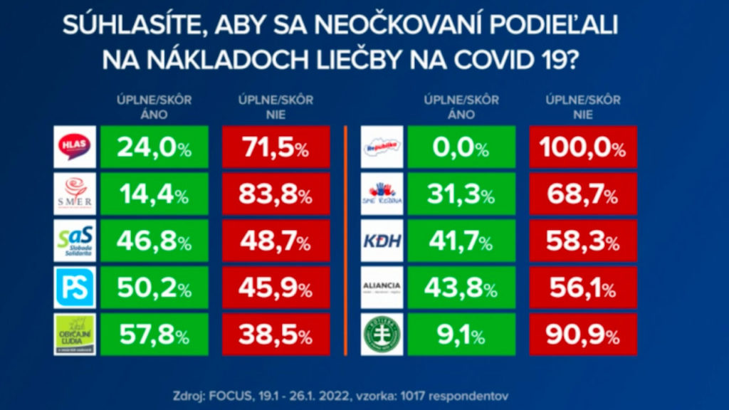 Agentúra Focus realizovala prieskum od 19. do 26. januára 2022 na vzorke 1017 respondentov. Opýtaní dostali otázku: „Súhlasíte alebo nesúhlasíte s tým, aby sa ľudia, ktorí sa bez závažného zdravotného dôvodu nedajú zaočkovať proti ochoreniu COVID-19, podieľali na nákladoch na liečbu, ak ju budú pri tomto ochorení potrebovať? (napr. hospitalizácia v nemocnici).“