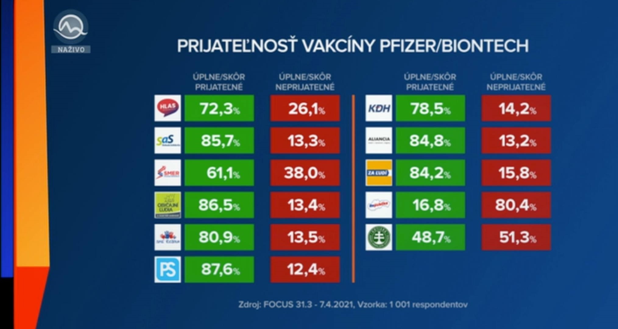 Prieskum však ukázal, že vakcína od Pfizer je na tom o niečo lepšie. Najviac jej dôverujú voliči strany Progresívne Slovensko (87,6 percenta), no nezaostávajú ani voliči OĽaNO (86,5 %), Sloboda a solidarita (85,7 %) a Sme rodina (80,9 %). Pod 50 % sa dôveryhodnosť tejto vakcíny a to v prípade strany ĽSNS (48,7 %) a strany Republika (16,8 %).