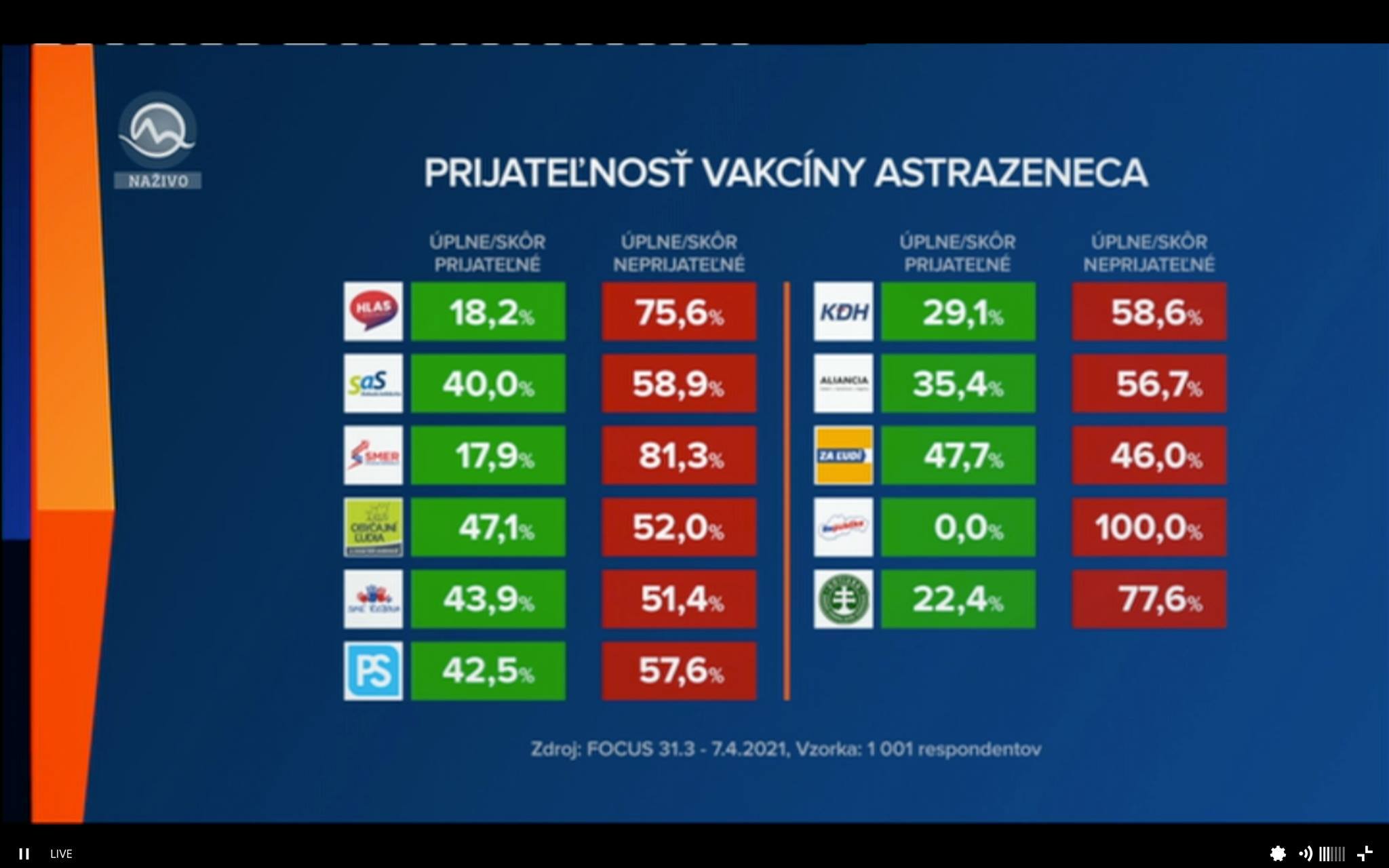 Televízia Markíza si kvôli relácii Na telo nechala urobiť podobný prieskum. Výsledky ukázali, že vakcína Astrazeneca má najväčšiu dôveru u voličov strany Sme rodina. Naopak, najmenej jej dôverujú voliči strán Smer-SD (17,9 %), Hlas (18,2 %) a Republika (0,00 %).