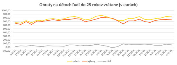 Od začiatku roku 2017 po koniec júna 2019 boli príjmy klientov Poštovej banky vo veku 25 a menej rokov v priemere iba o 45,28 eura vyššie než ich výdavky. V niektorých mesiacoch neboli v pluse ani 20 eur, prípadne minuli viac, než zarobili,“ približuje L. Žáčková.