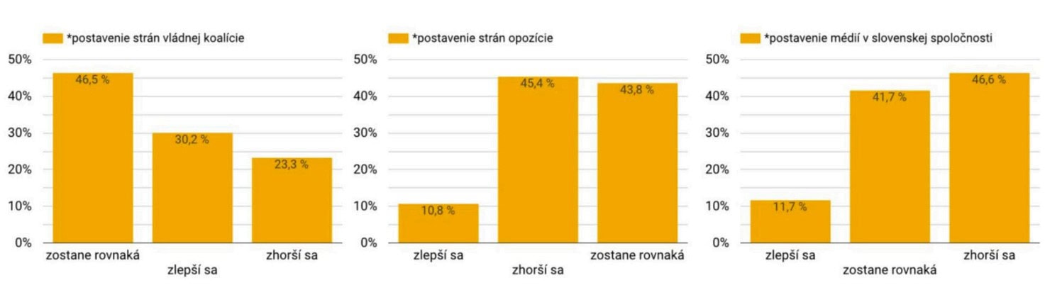 „Negatívne vnímanie budúcnosti oslovenými, obzvlášť sympatizantmi súčasných opozičných strán, ešte viac podčiarkuje ich očakávanie zhoršenia postavenia médií. V ich prípade až 46,6 % predpokladá, že sa oproti súčasnému stavu ich postavenie zhorší a podobne to vychádza aj v prípade postavenia samotnej opozície. Tam má toto očakávanie 45,4 %. Pre porovnanie, v prípade koaličných strán zhoršenie očakáva len 23,3 % a zlepšenie dokonca 30,2 % respondentov,“ uzavrel Klus.
