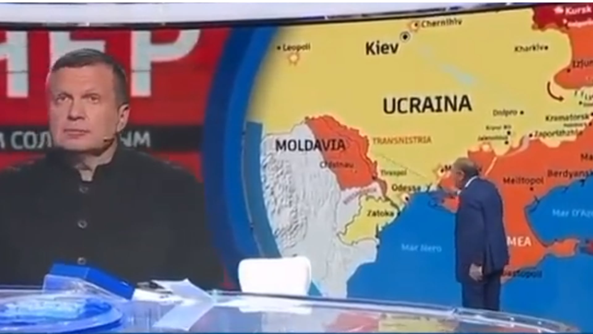 Solovjov sa pokúsil pokračovať, ale taliansky moderátor ho prerušil. „Nie, nie, nie, počkajte, to je zaujímavé,“ povedal ostrieľaný Talian, ktorý na mape začal ukazovať niekoľko území, ktoré boli napadnuté počas invázie.