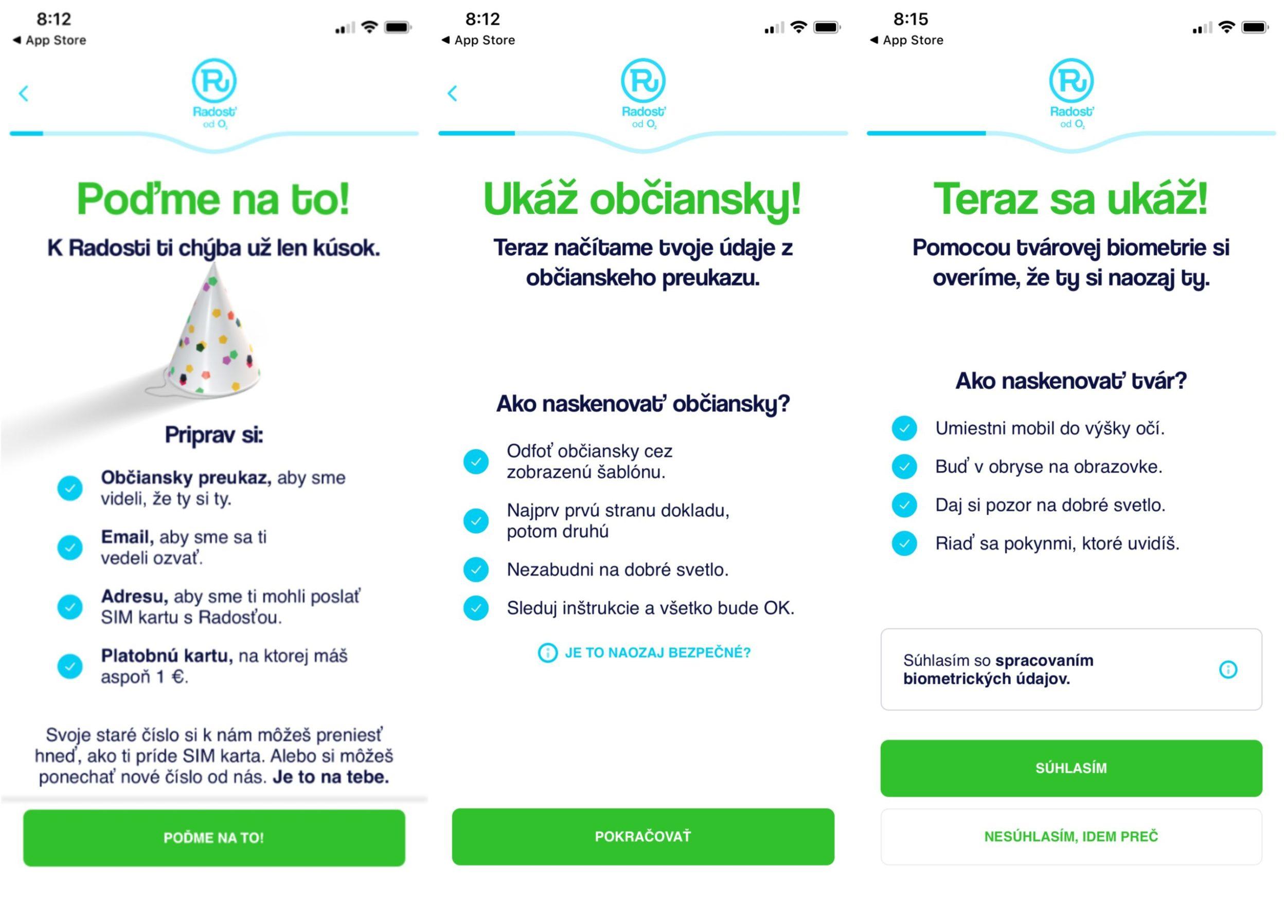 Aplikácia sa overovacím procesom podobá moderným mobile bankingom a začiatočný proces zvládne každý bez akéhokoľvek návodu. Radosť si vypýta tvárovú biometriu, skontroluje pohyb očí a pýta si aj sken občianskeho preukazu. Potom treba 2 – 3 pracovné dni čakať, kým kuriér prinesie SIM-ku, samozrejme zadarmo.