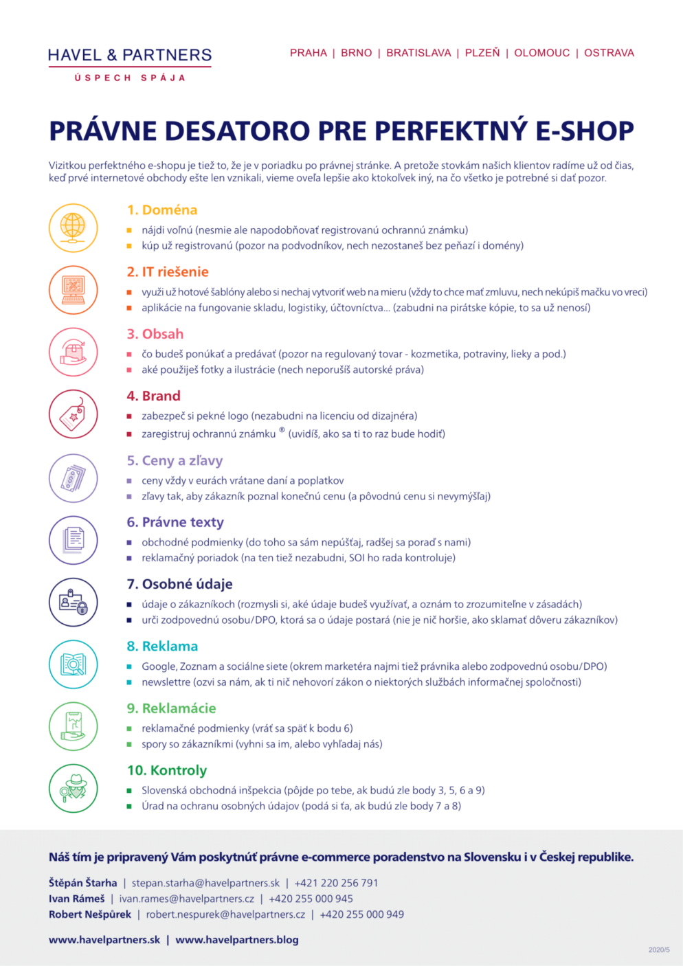 Nakoľko sa rok od roka sprísňuje a stáva komplikovanejšou právna regulácia, e-shopy, ktoré vznikli narýchlo v rámci „boja o prežitie“ môžu mať celý rad právnych nedostatkov, za ktoré hrozia vysoké pokuty. Obráťte sa na našich odborníkov špecializujúcich sa na e-commerce z HAVEL & PARTNERS , ktorí disponujú detailnou znalosťou spotrebiteľského práva, majú skúsenosti s činnosťou kontrolných orgánov a súdov a sú vám pripravení poskytnúť svoje praktické skúsenosti pri vytváraní perfektného e-shopu. Taktiež pre vás pripravili pomôcku „PRÁVNE DESATORO PRE PERFEKTNÝ E-SHOP“.