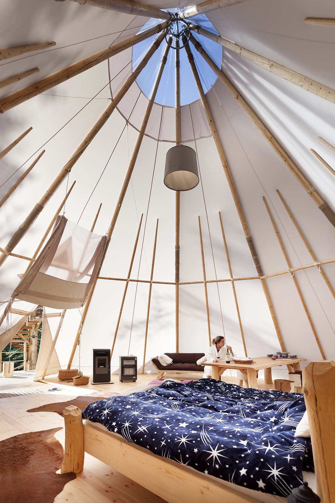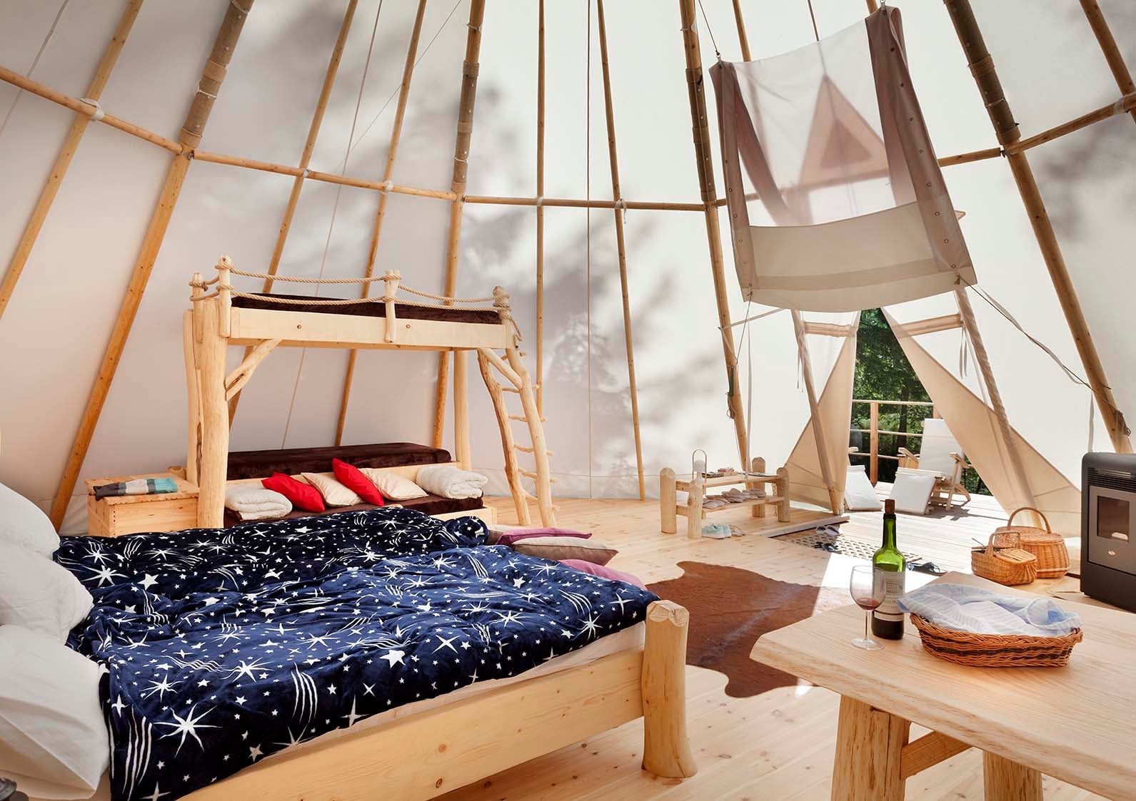Stan bol ušitý na mieru, interiér navrhol majiteľ a vyrobili ho miestni remeselníci. Ak by si sa rozhodol vyskúšať teepee v zime, nemusíš sa obávať, je otvorený celoročne a tomu aj prispôsobený.