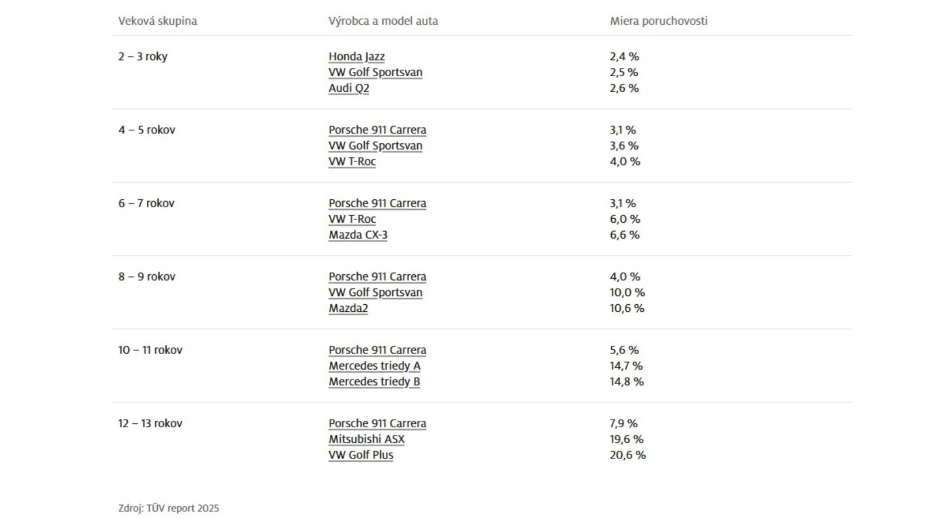 Celkovo rebríček potvrdzuje trendy z minulých rokov. Jednotlivé modely sa síce presúvajú medzi vekovými kategóriami, ale celkový obraz zostáva podobný. Ak si chceš kúpiť auto, tento rebríček ti pomôže urobiť lepšie rozhodnutie. Nájdeš v ňom totiž presné údaje o poruchovosti každého modelu vyjadrené v percentách.