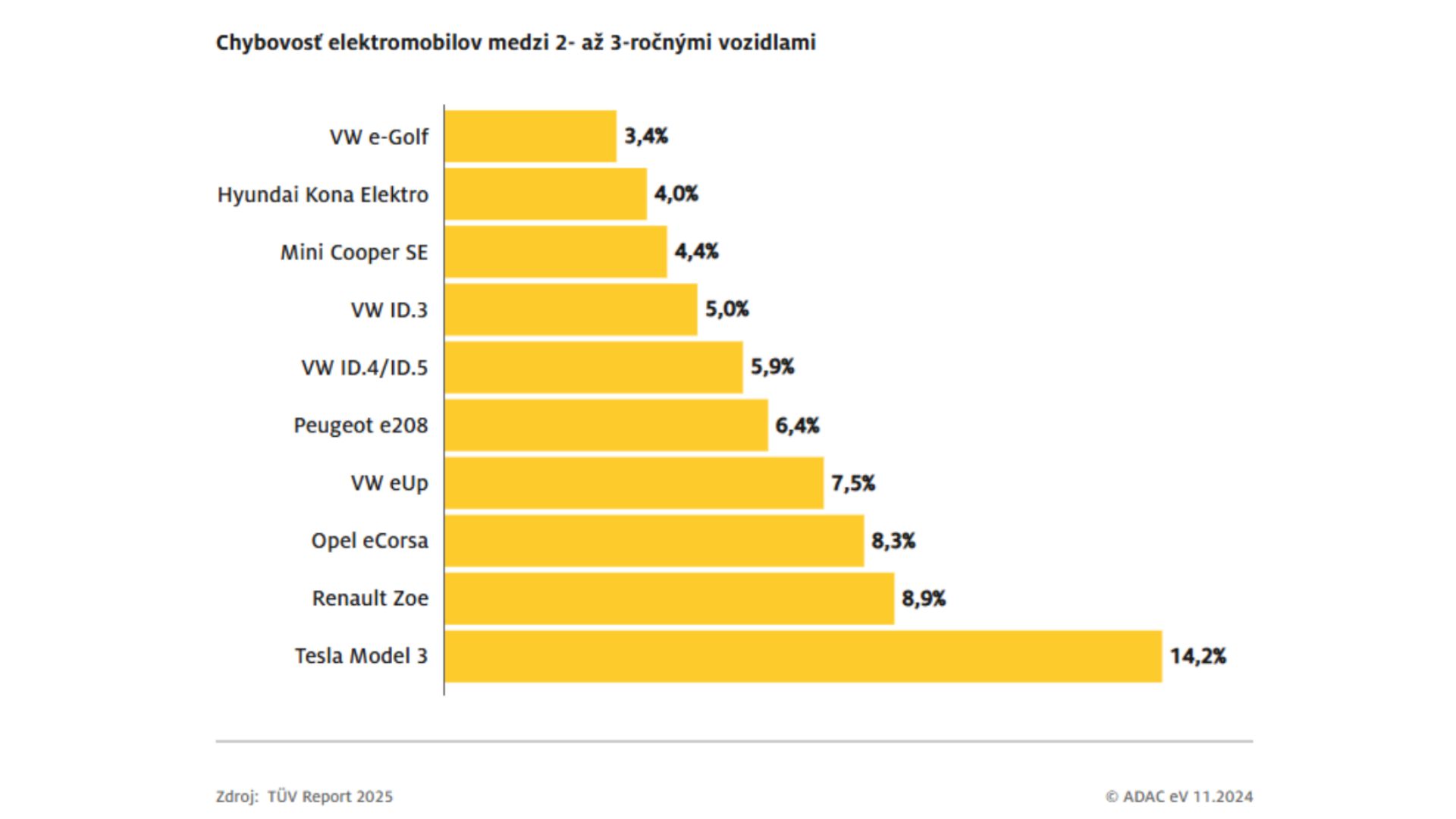 Príjemne ťa prekvapí Volkswagen e-Golf. Tento už nevyrábaný model obsadil deviatu priečku medzi všetkými 111 testovanými dvojročnými až trojročnými autami. Jeho poruchovosť dosiahla len 3,4 percenta. Na druhej strane ťa možno zarazí umiestnenie Tesly Model 3. S poruchovosťou 14,2 percenta skončila na poslednom mieste nielen medzi elektromobilmi, ale aj v celkovom poradí áut starých 4-5 rokov.