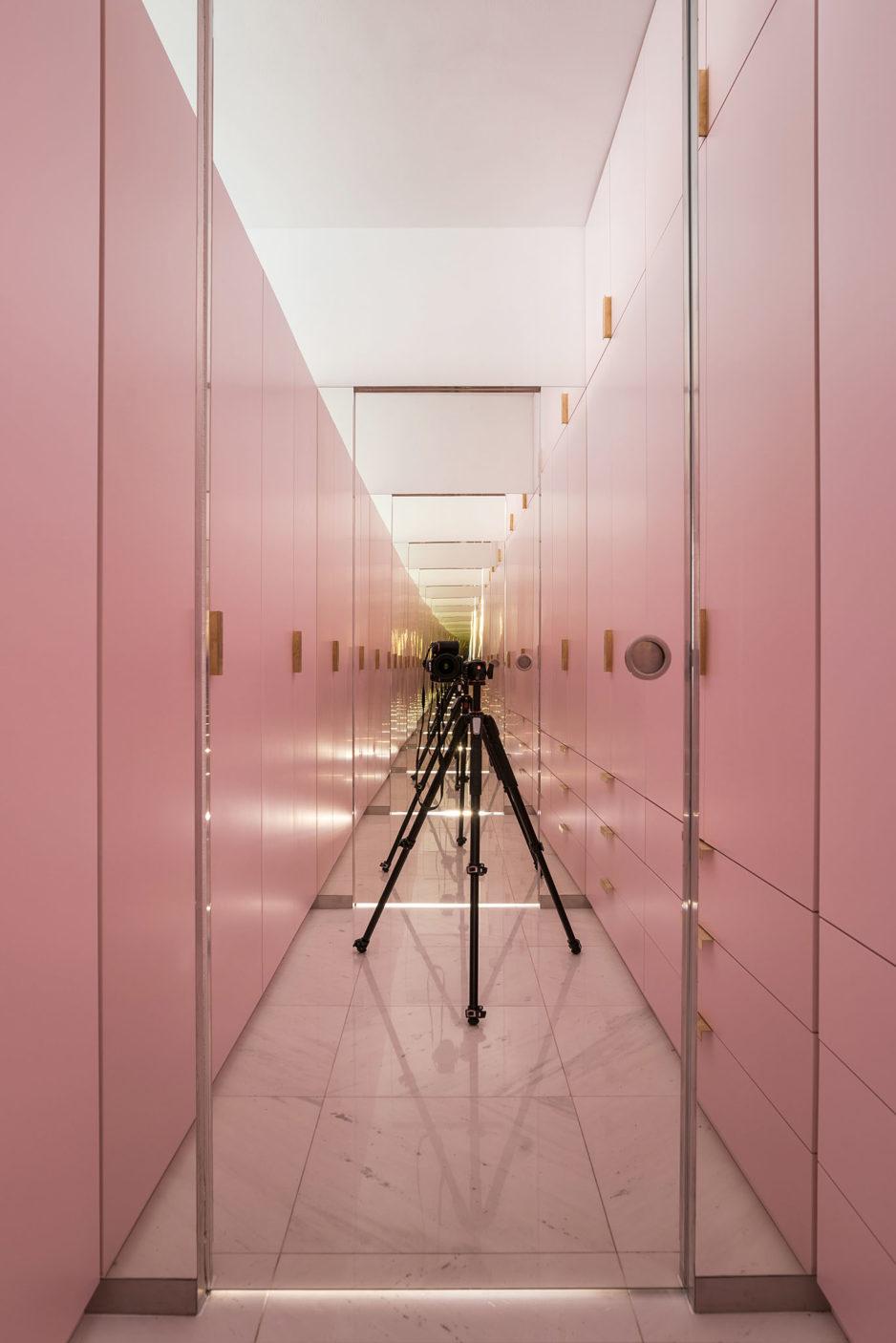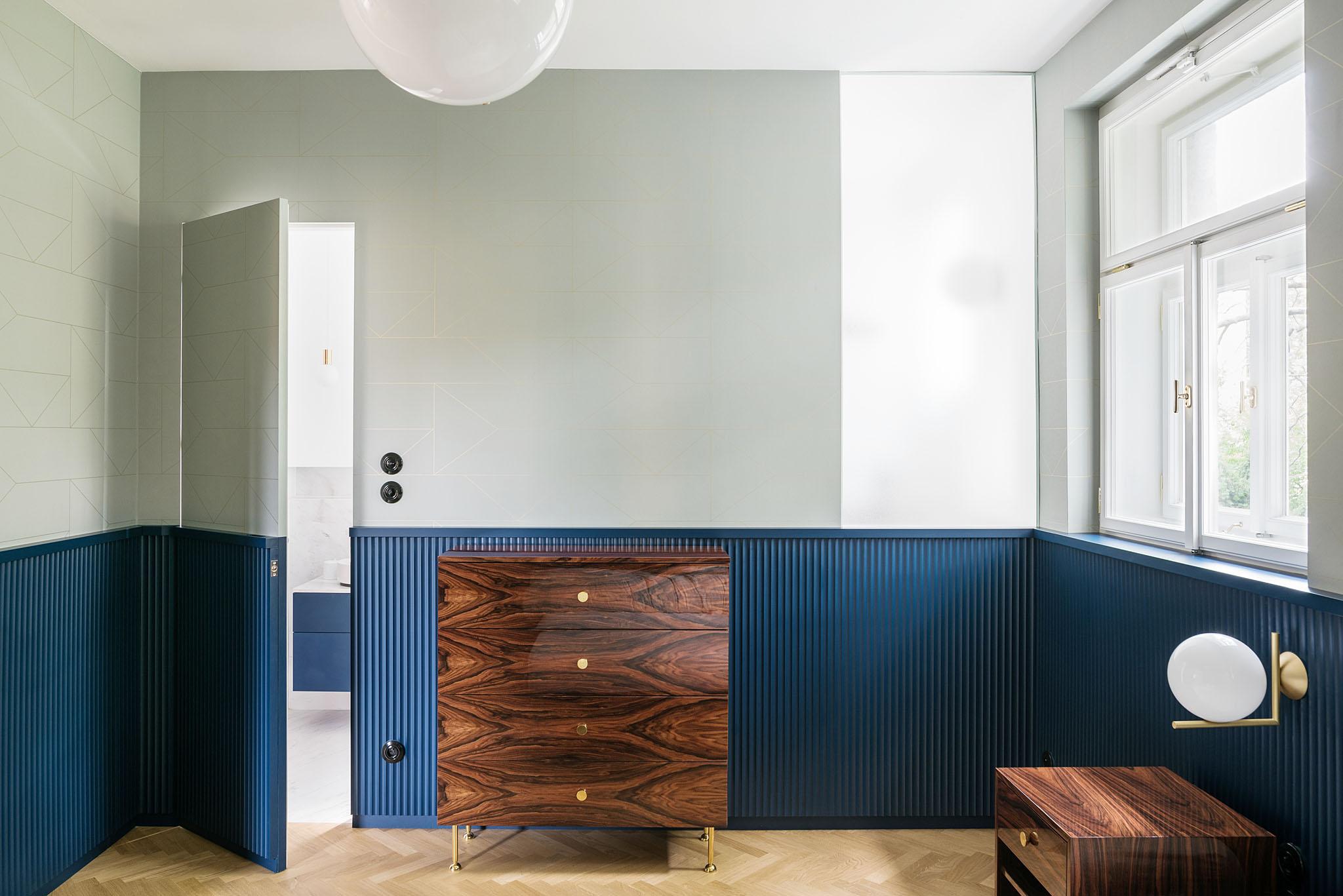 Okrem klasických materiálov (kameň, drevo, mosadz) sa architekti nebáli v interiéri použiť frézovanú MDF dosku striekanú na modro (profilovaný sokel či dvierka kuchynskej linky), ako aj ružovú farbu v priechodnom šatníku. Výsledok naozaj stojí za to a v dnešnej dobe plnej prefabrikátov ide o skutočnú raritu.