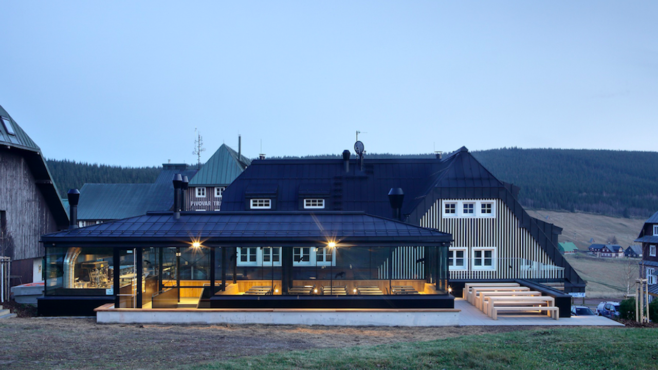 Pred časom sme predstavili Minipivovar Trautenberk v najvyššie položenej krkonošskej obci Horní Malá Úpa (1045 m n. m.). Realizácia ateliéru ADR bola ocenená titulom Finalista Českej ceny za architektúru, získala Cenu Agentúry ochrany prírody a krajiny ČR za “citlivú rekonštrukciu stavby v krajine.” Cez cestu, priamo oproti spomínanému minipivovaru bola dokončená ďalšia rekonštrukcia historického horského penziónu. Obnova sa aj tentokrát zaobišla bez výrazných zásahov do zovňajšku pôvodného objektu. Časť rozšíreného lokalitného programu našla svoje miesto v novej prístavbe, bezprostredne nadväzujúcej na svah lyžiarskeho areálu.