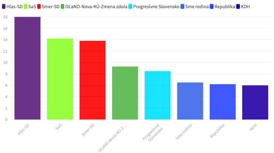 Najviac osôb, ktoré by sa k voľbám dostavili, by volilo stranu HLAS – sociálna demokracia. Tí by voľby vyhrali s 18 percentami. Na druhom mieste by sa umiestnila strana Sloboda a Solidarita, s 14,2 percentami. Za nimi sa podľa prieskumy nachádza SMER – Slovenská sociálna demokracia, ktorý by získal 13,8 % hlasov.