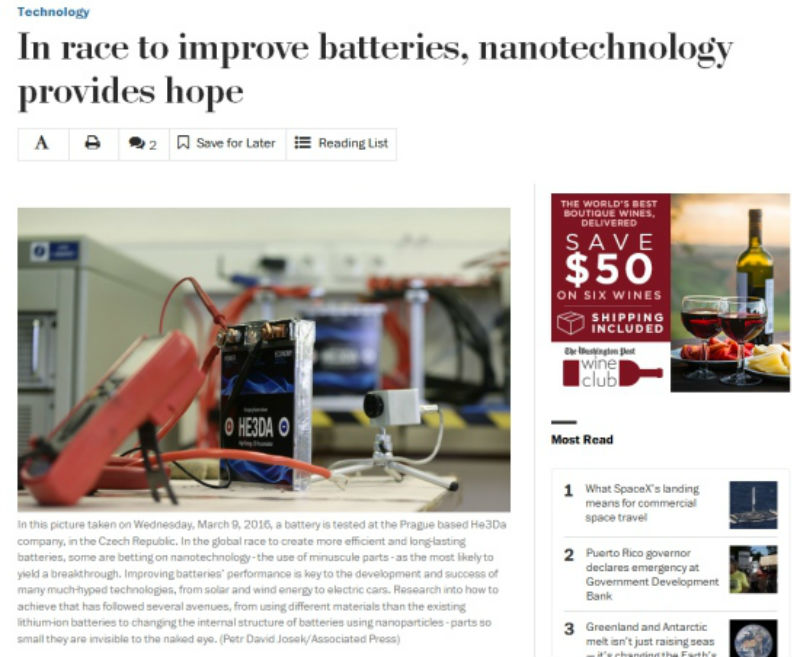 Batéria českého vedca Jana Procházku si navyše získala značnú pozornosť aj v zahraničí. Konkrétne v USA o nej publikoval článok aj známy The Washington Post. Ten niesol titulok „V pretekoch za vylepšeniami batérií dávajú nádej nanotechnológie“, no z neznámych príčin bol po niekoľkých dňoch z webu amerického média stiahnutý.
