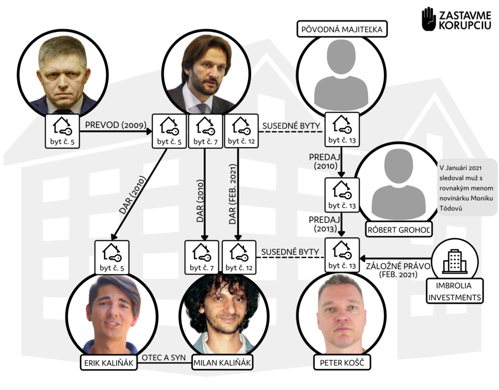 Peter K. vlastní v Ružinove byt na najvyššom poschodí od roku 2013 a jeho susedom bol dlho, až do februára tohto roka, podpredseda Smeru a exminister vnútra Robert Kaliňák. Podnikateľ byt kúpil od Roberta Grohola (v katastri je bez diakritiky, poznámka NZK). Muž s menom Róbert Grohoľ sledoval podľa Denníka N začiatkom roka novinárku Moniku Tódovú. V rovnakom čase mal Smer presné informácie o jej pohybe a vyrukoval s nimi aj na tlačovej besede,“ vysvetlila nadácia.