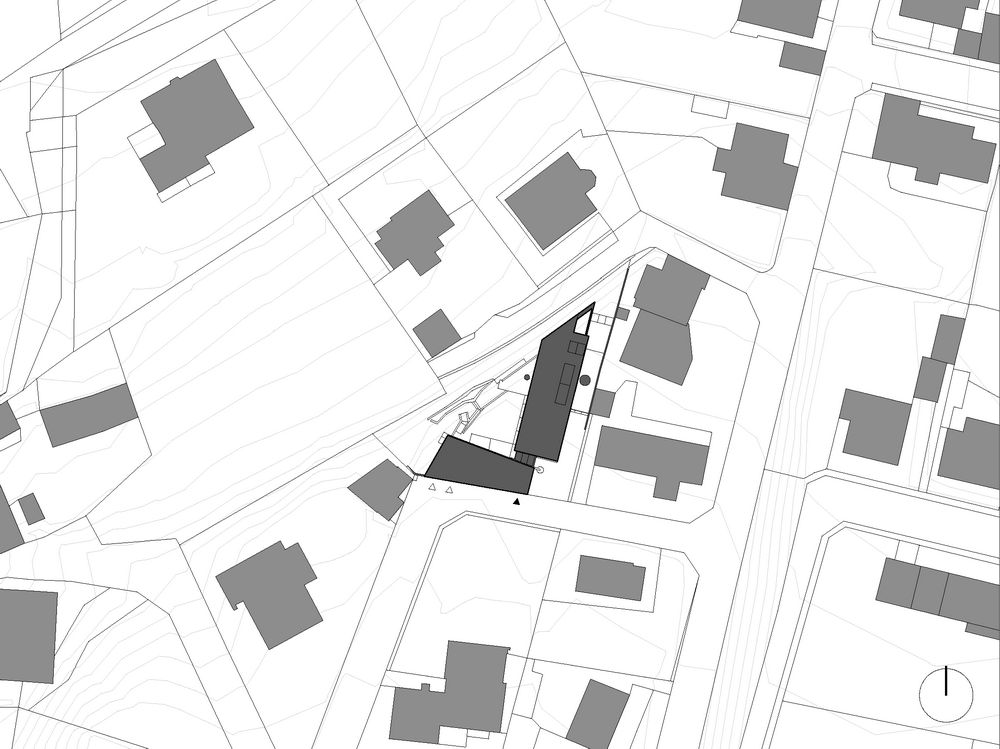 Dom využíva zložitý trojuholníkový tvar pozemku a výškový rozdiel medzi nástupom z ulice a jeho hornou hranou. Hmoty domu a svah medzi sebou vymedzujú vnútorné nádvorie s intímnou atmosférou.