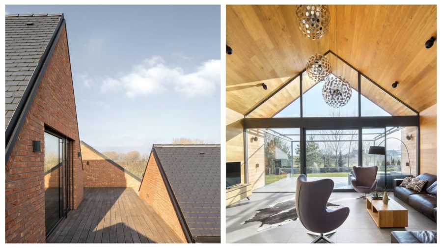 Architekti vďaka zaujímavej hre s priestormi, ktoré sa odvíjajú od centrálnej časti dispozície situovanej pod umelou terénnou vlnou, opticky oddeľujú jednotlivé funkčné zóny domu. Zdanlivo samostatne stojace objemy, s rôznou orientáciou a výškou hrebeňa strechy, na prvý pohľad evokujú “rastlú” vidiecku zástavbu.