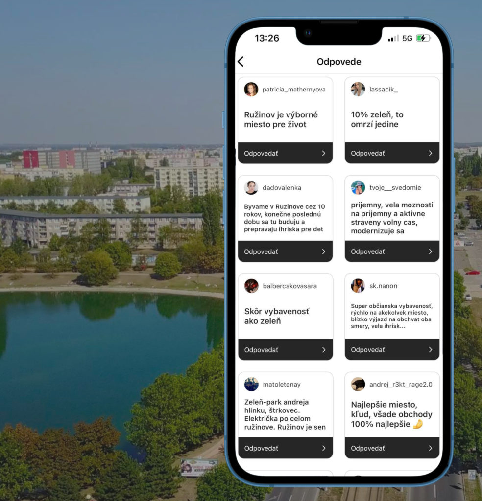 Startitup zisťoval aj samotné názory a postoje Bratislavčanov k Ružinovu. V instagramovej ankete Slováci oceňujú množstvo parkov a zelených plôch. Za veľkú výhodu považujú občiansku vybavenosť, množstvo ihrísk pre deti či skvelú dostupnosť MHD.