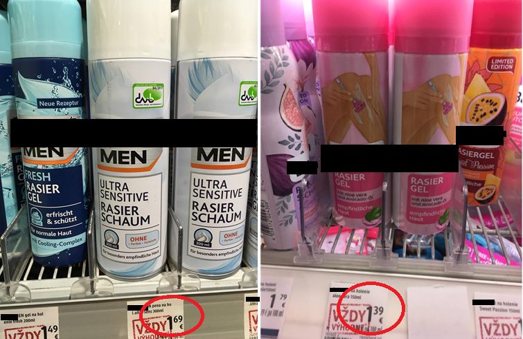 Našli sme však aj vyššie ceny pre „ružové“ produkty pri jednej nemenovanej značke. Napríklad dámska žiletka, 1 kus bez žiadnej násady, stála 3,49 eur. Pánska žiletka od tej istej značky, 1 kus + 2 násady v cene + 2 násady grátis, stála 2,49 eur. Cenový rozdiel pri tej istej značke bol aj pri holiacich penách. Páni majú k dispozícii 300 ml za 1,69 eur a dámy len 150 ml za 1,39 eur. Teda polovičný objem, ale nie polovičná cena.