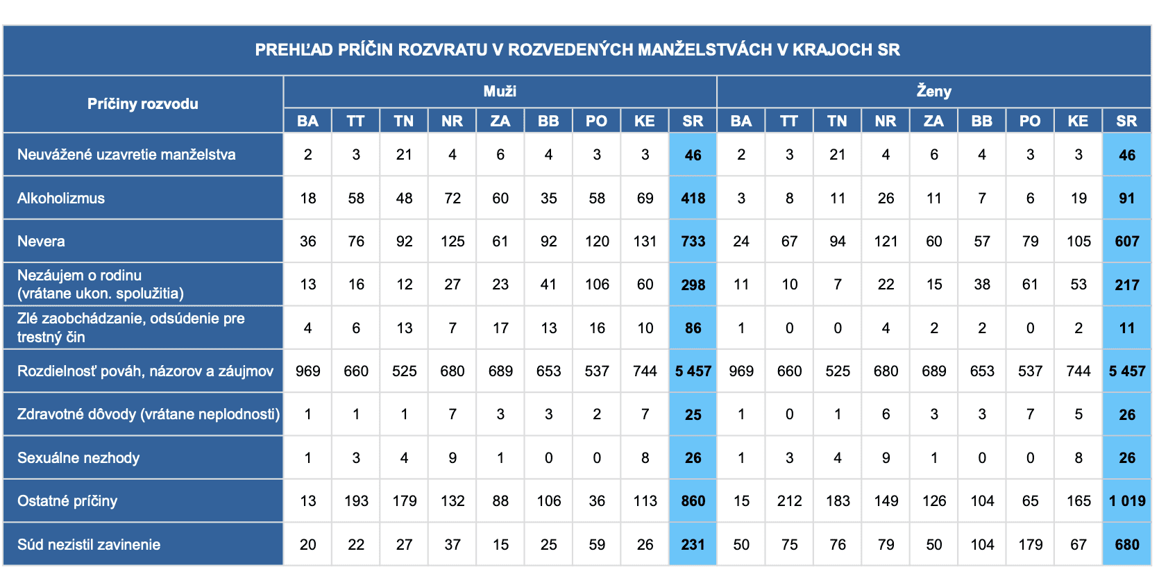 Najčastejšou príčinou rozvratu v rozvedených manželstvách v Slovenskej republike v roku 2022 bola rozdielnosť pováh, názorov a záujmov, a to v 5 457 prípadoch – čo predstavuje dôvod pri 67 % rozvedených manželstvách.