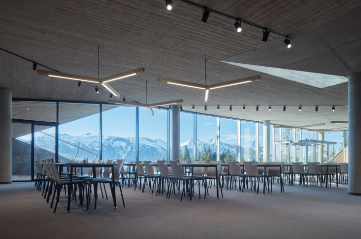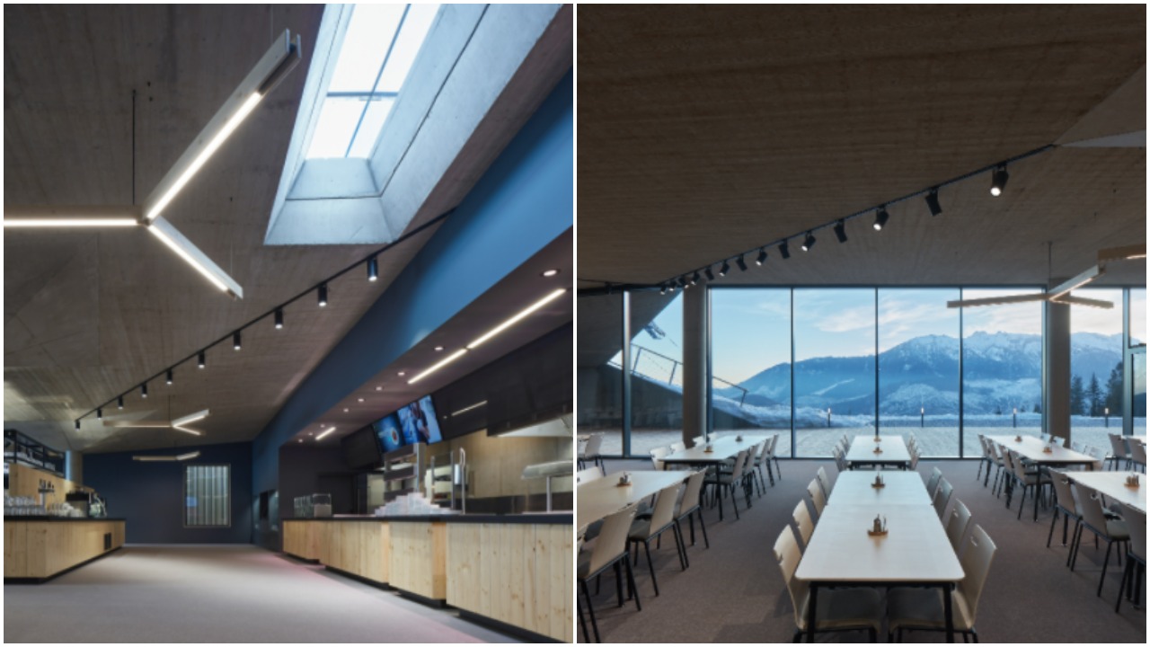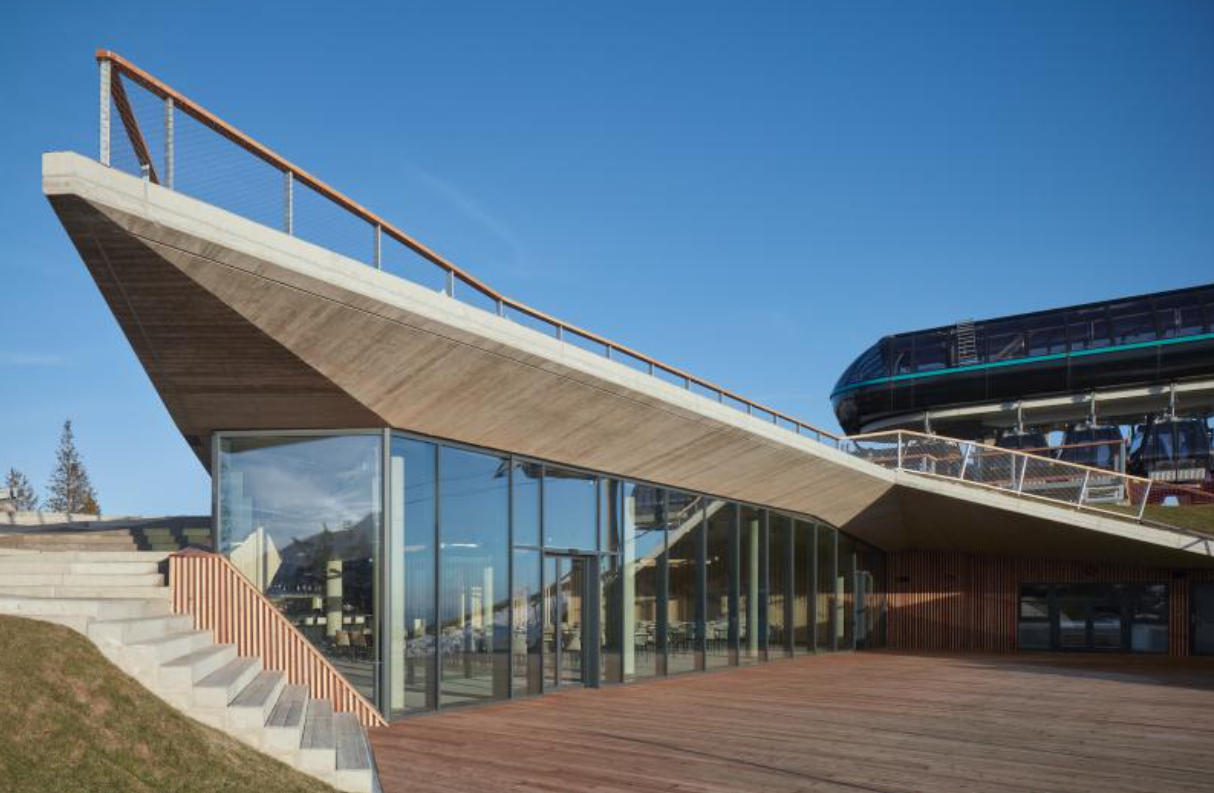 Budova zaujme už na prvý pohľad svojím netradičným tvarom. Ten bolo možné vyskladať vďaka smrekovým doskám, ktoré dopĺňajú betón a drevo. Pre tieto materiály sa architekti rozhodli kvôli tomu, že dokonale ladia s horským prostredím.