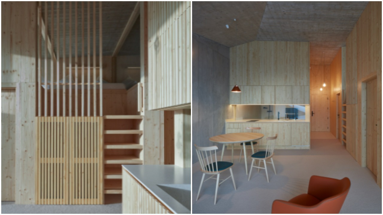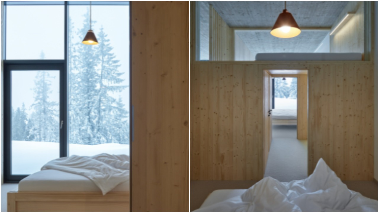 Hoci exteriéru budovy dominuje betón, v interiéri to je drevo. Nachádza sa napríklad aj na stenách apartmánov, ktorú sú taktiež súčasťou stavby. Drevo však nájdeš aj v dennej časti ako obklad barových pultov alebo deliacich priečok.