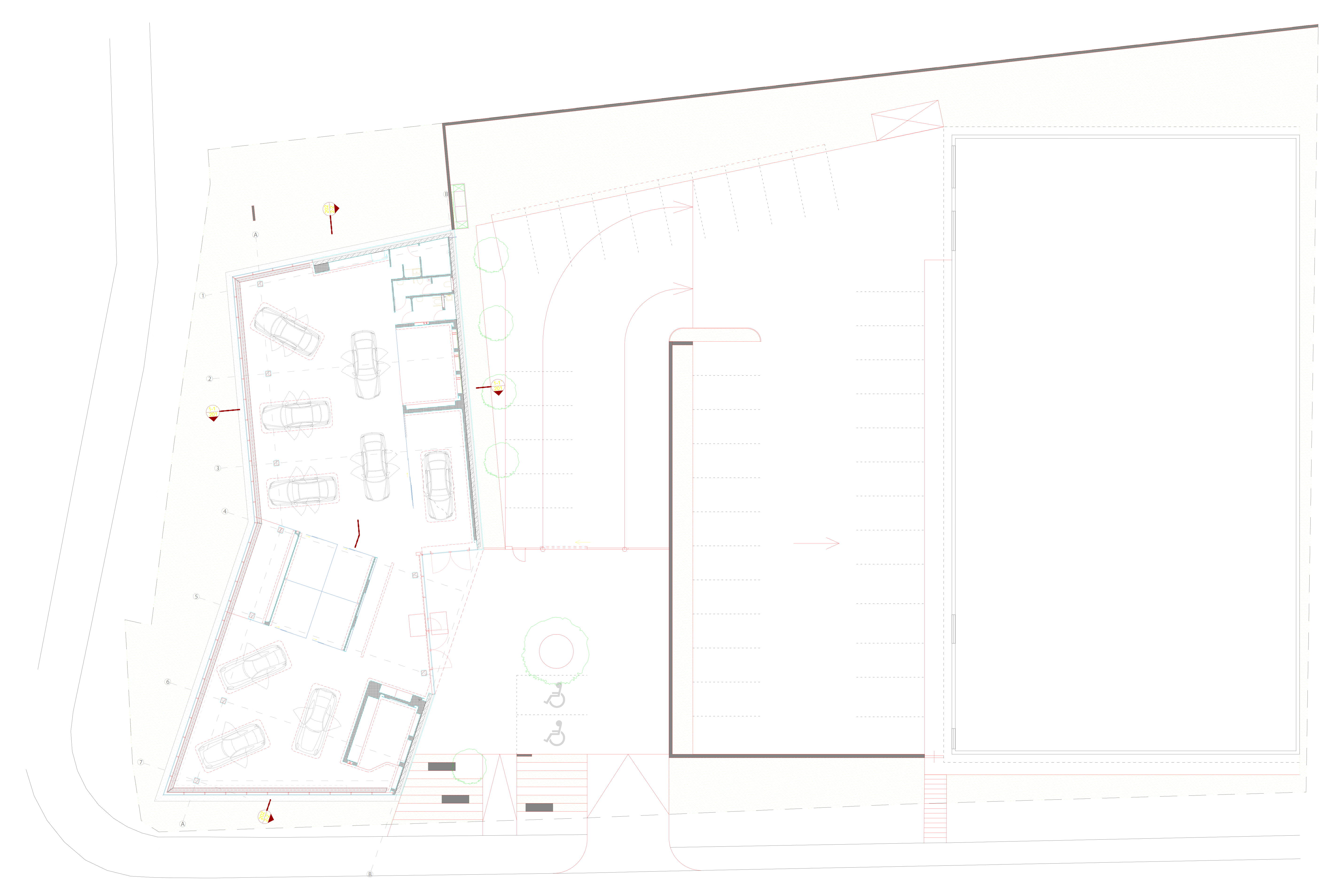 Architekti riešili okrem samotného showroomu aj prevádzku celého areálu. Medzi novým showroomom a servisom vznikol uzavretý dvor. Nájazd do areálu je o 3 metre nižšie, než vjazd do servisu. Architekti prekonali tento výškový rozdiel pomocou rôzne tvarovaných šikmých plôch-rámp, na ktorých sa dá zároveň parkovať. Tieto rampy sú ohraničené opornými múrmi z pohľadového betónu, v ktorých je zároveň zabudované osvetlenie. Vjazd do areálu je vydláždený reprezentatívnou veľkoformátovou dlažbou. Vďaka 4 metre vysokým bezprahovým vstupným dverám exteriér plynule prechádza do interiéru.