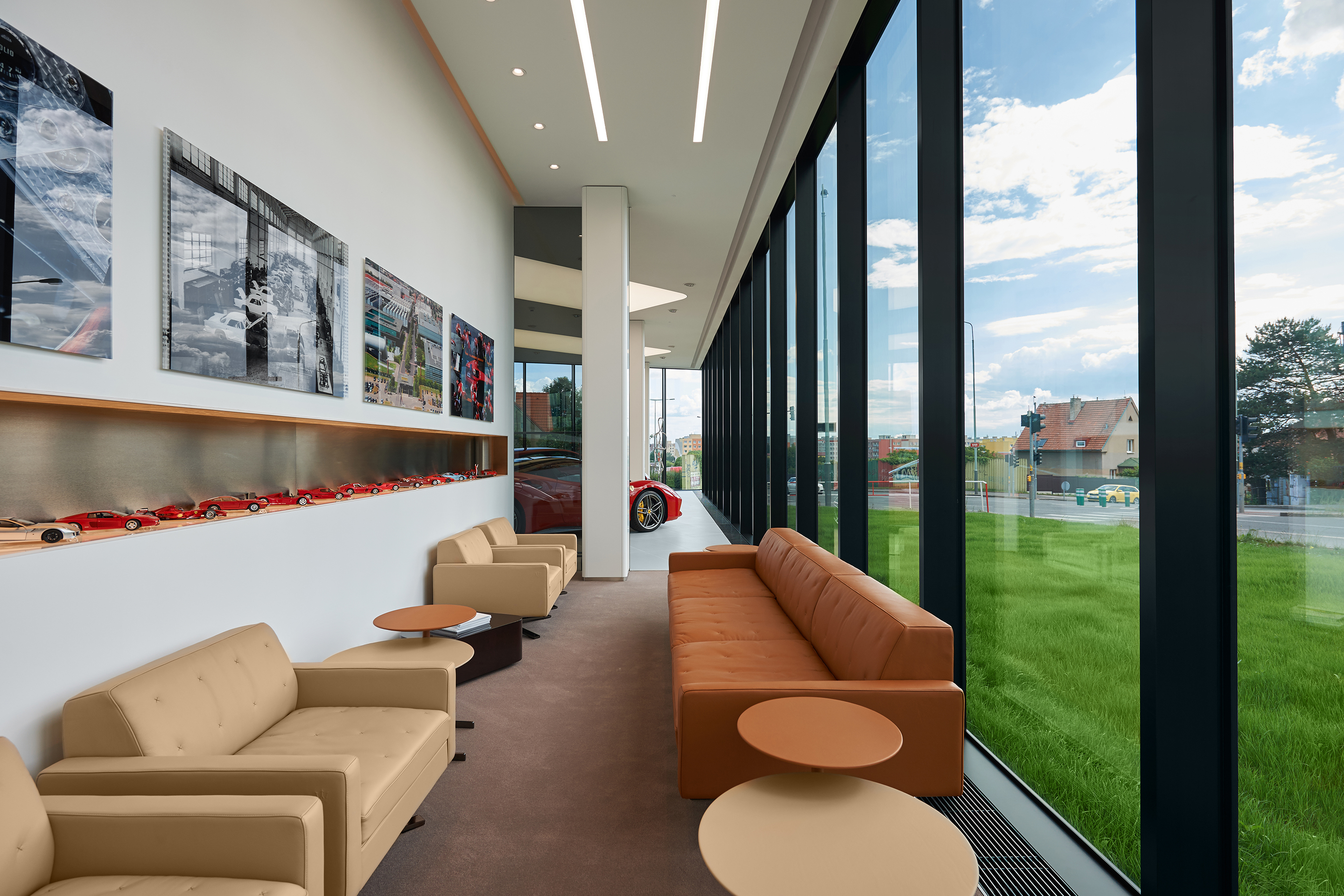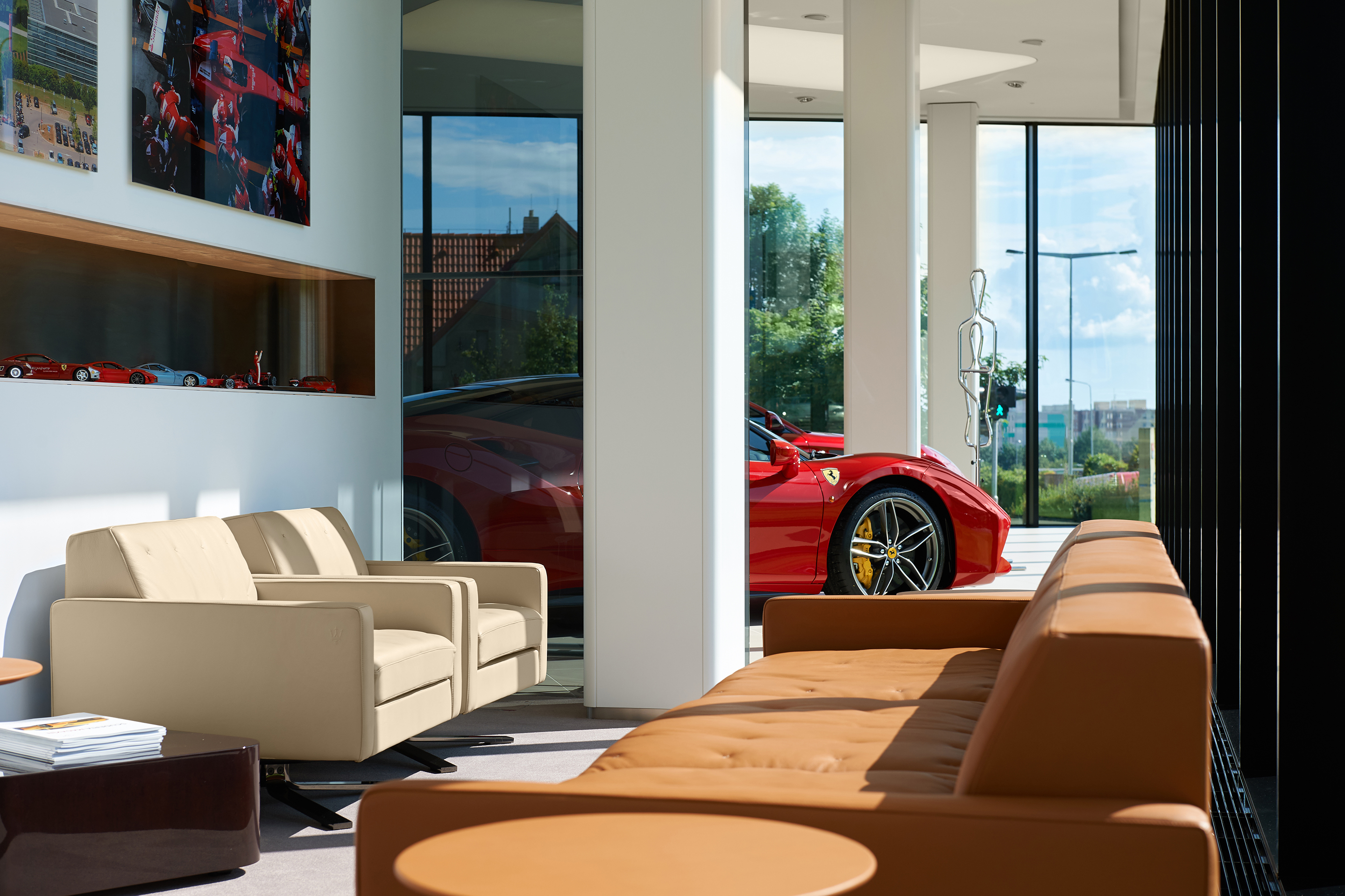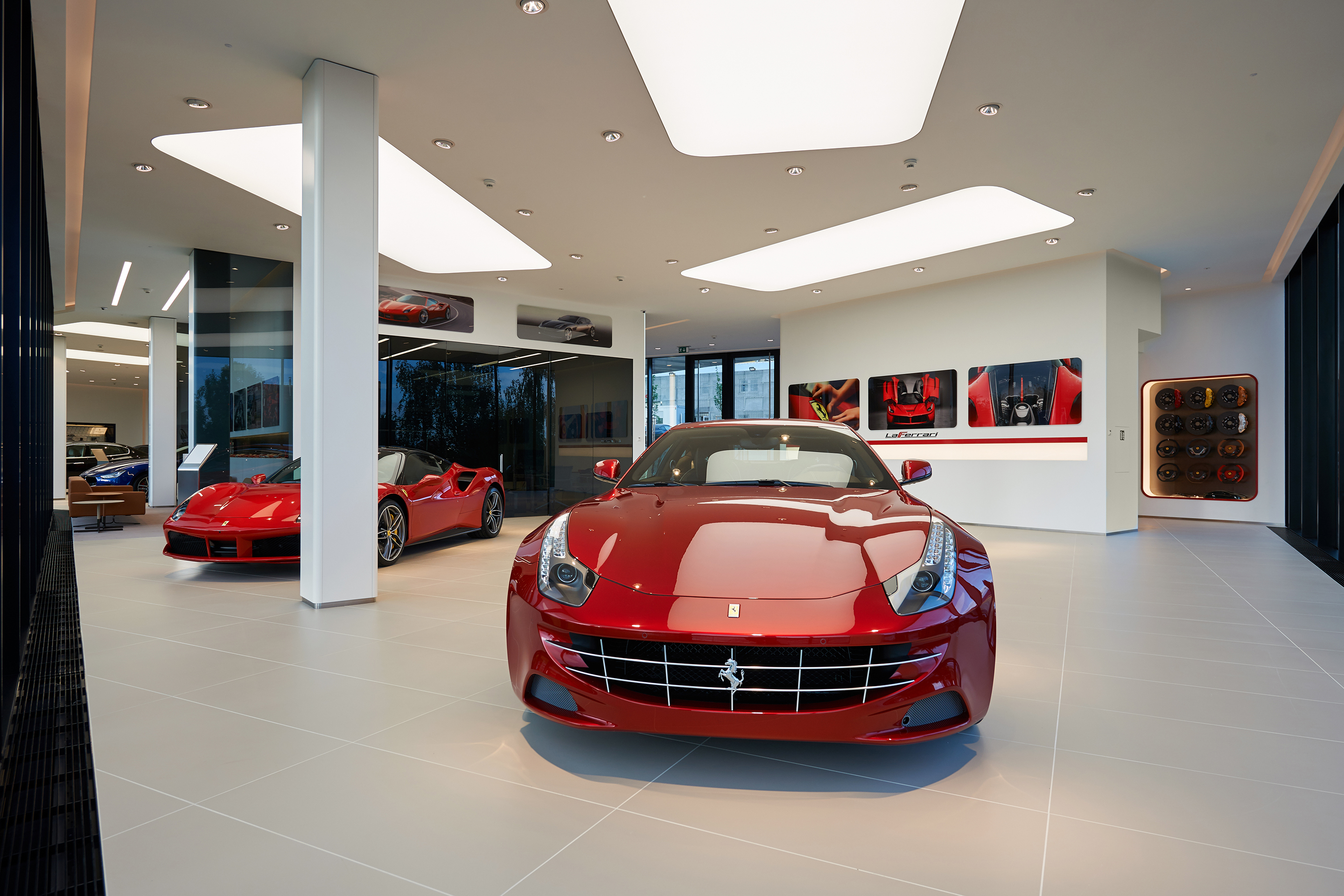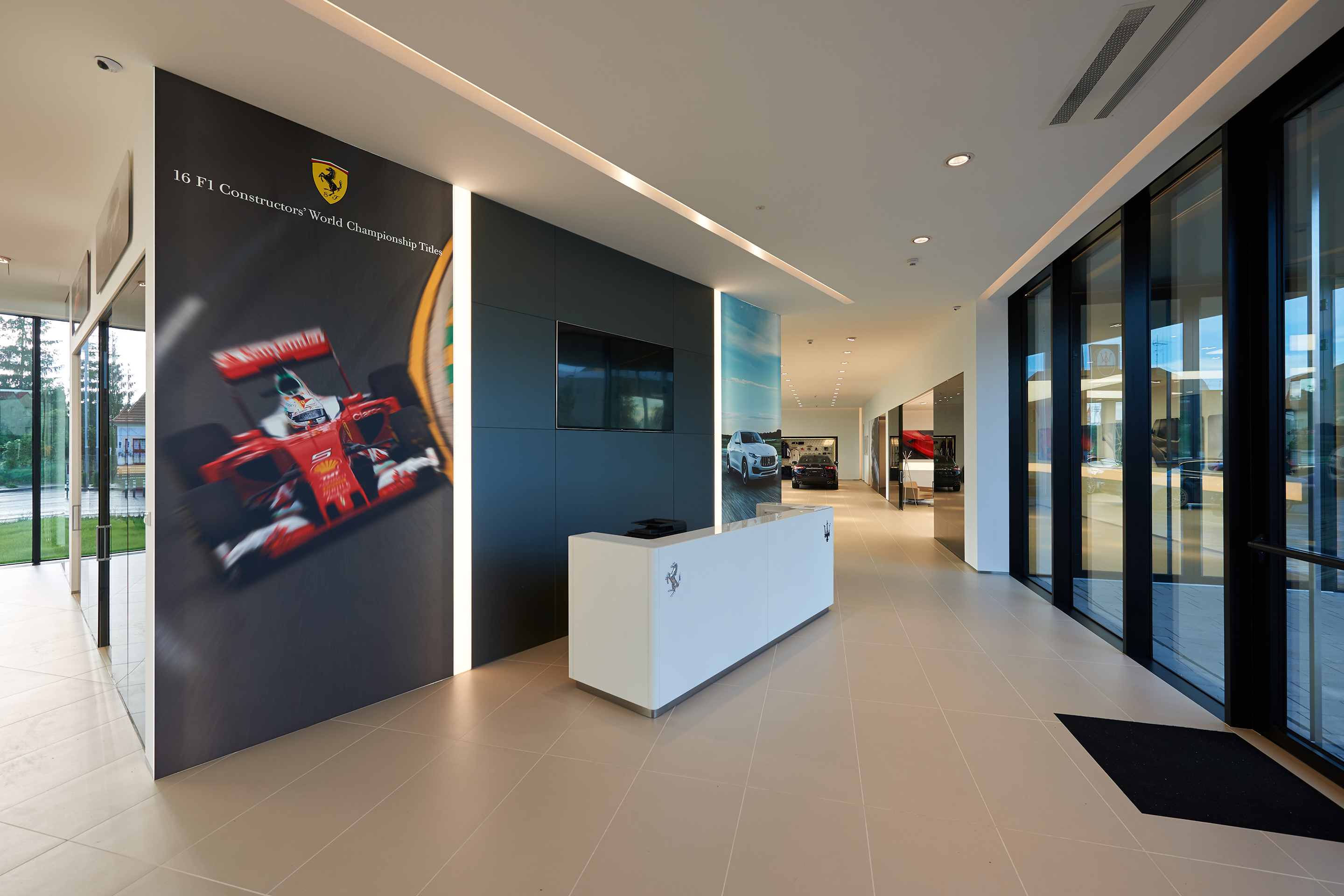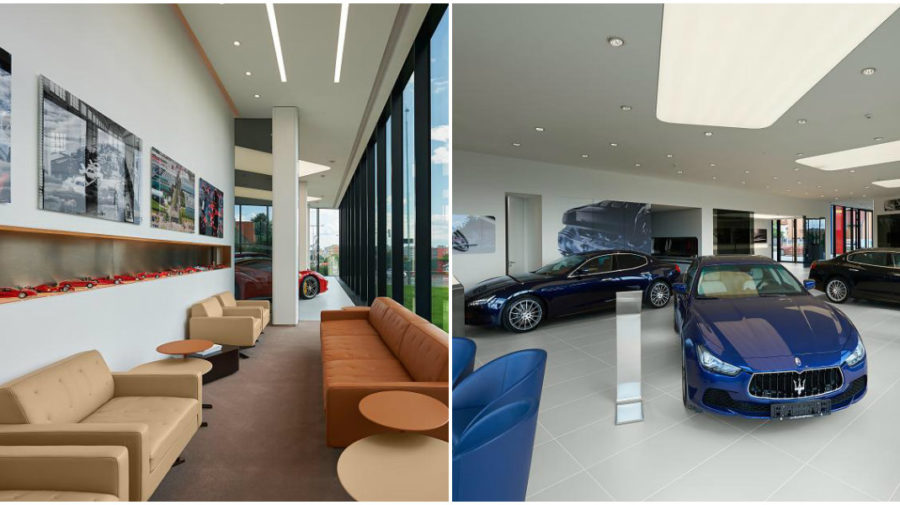 Interiér odráža renomé značiek Ferrari a Maserati. Ide o čisté a línie s precíznym detailom. Automobily sú v interiéri vystavené ako v galérii. Zhora sú autá nasvietené cez barrisolové blany. Prvky vystavované v konfiguračných miestnostiach sú umiestňované do svetelných nik, ktoré sú potiahnuté kožou.