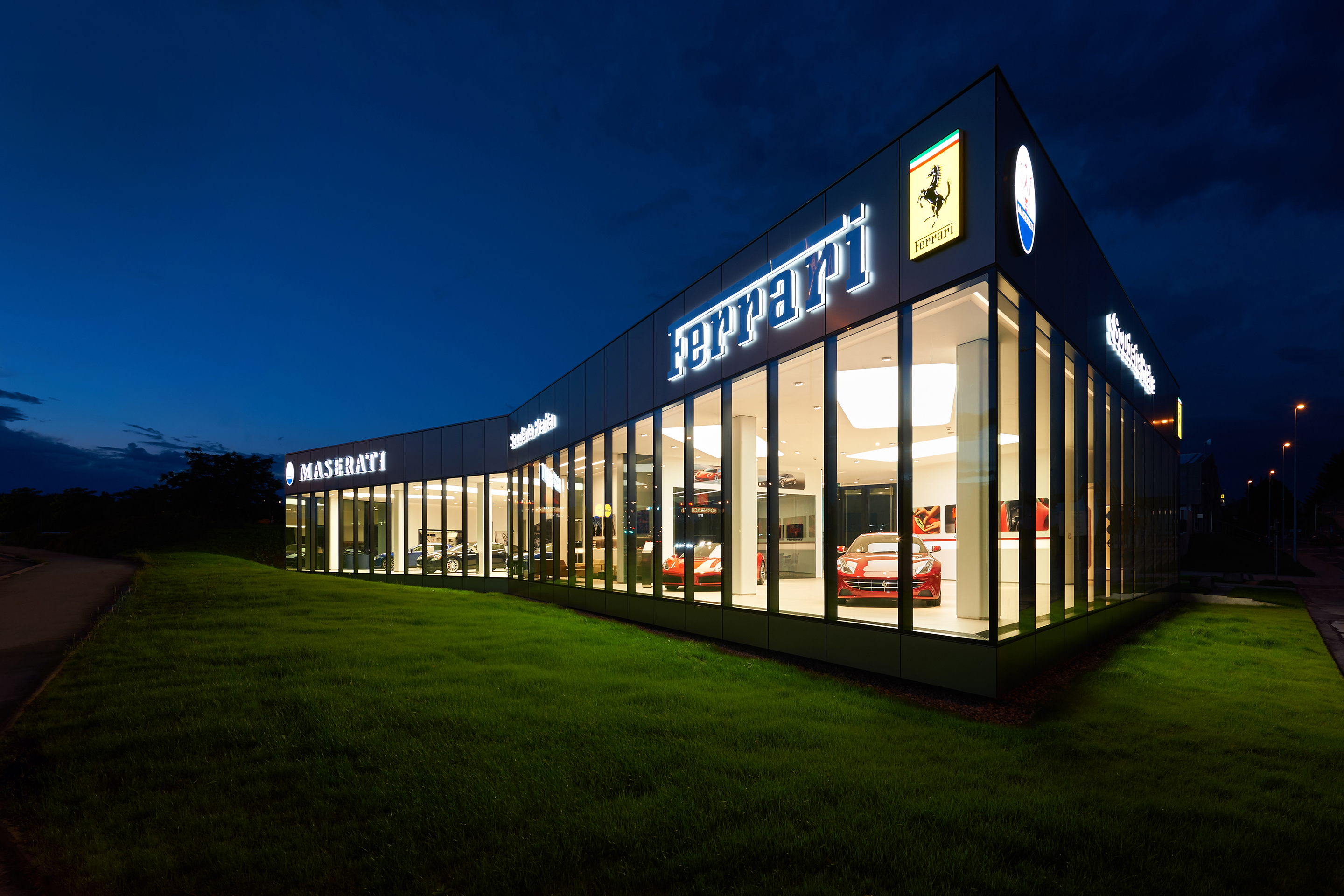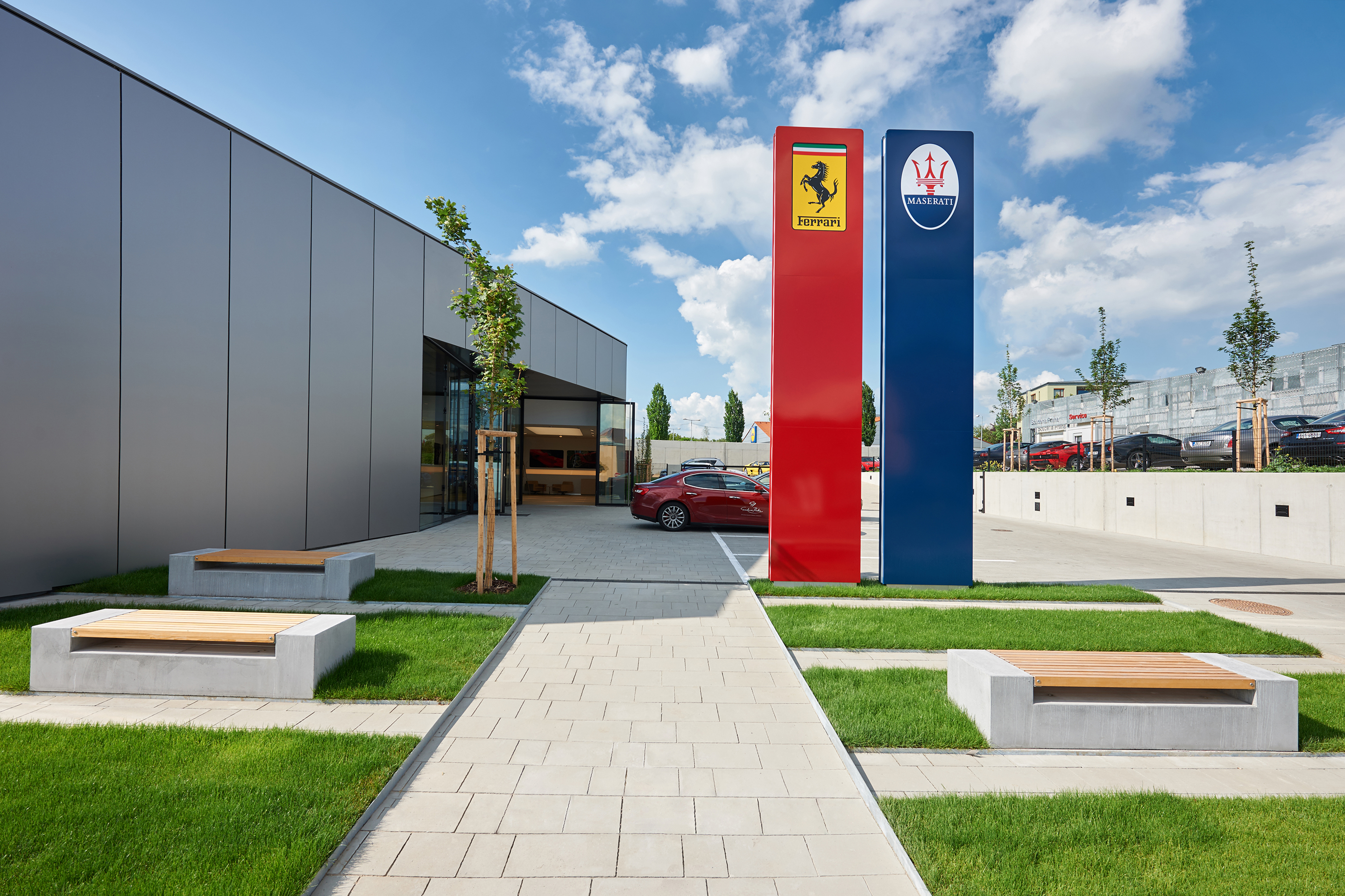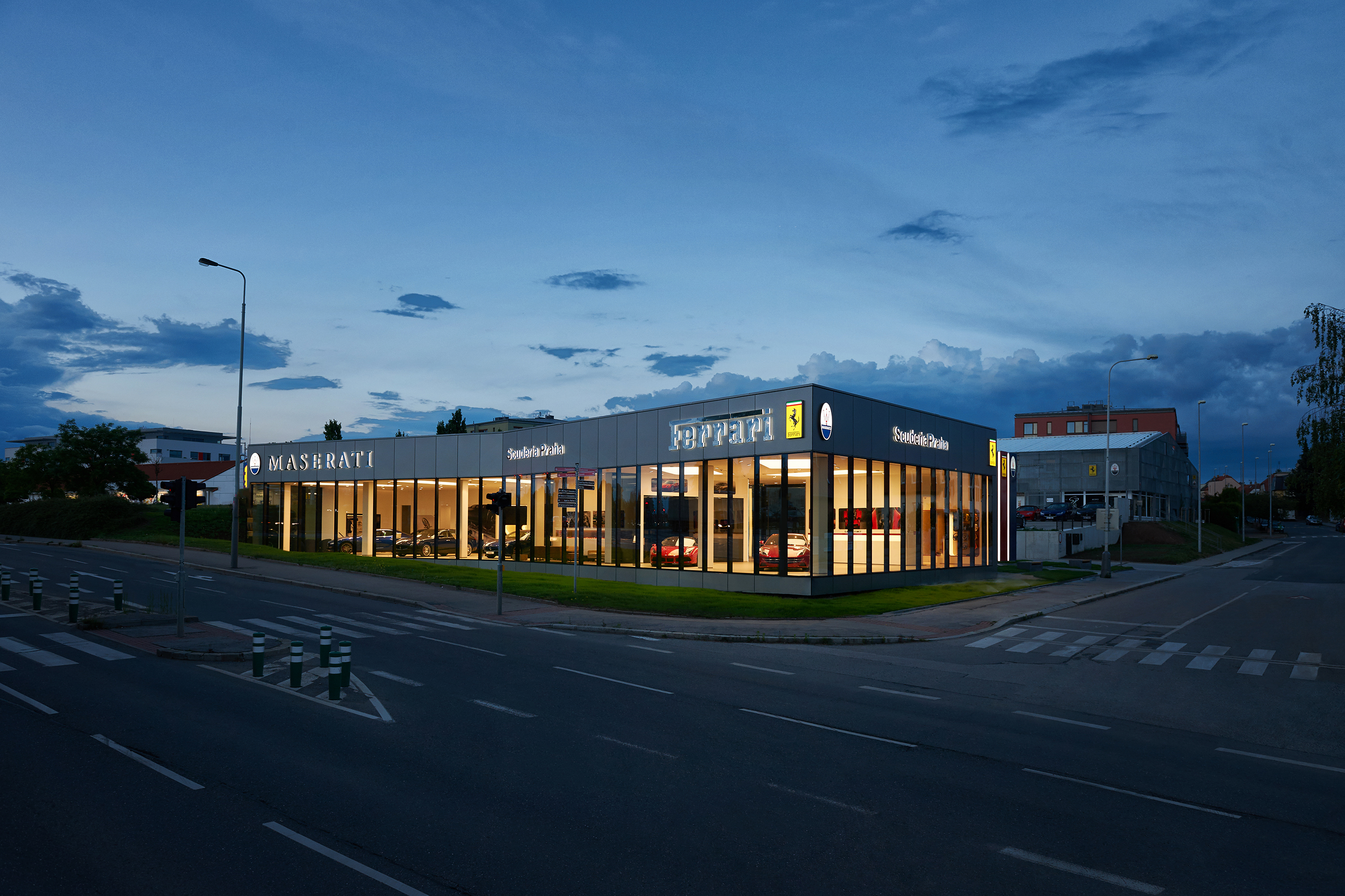 „Lehké vykonzolování jihozápadního rohu objektu dodává budově na lehkosti. Ostré a čisté tvary showroomu jsou inspirovány tvaroslovím automobilů Ferrari osmdesátých let. Vstup do objektu evokuje boční chladící sání legendárního Ferrari Testarossa. Urbanistické tvarování a zalomení objektu do tvaru V potom reaguje na zalomení ulice Slánská. Tímto lehkým natočením je zároveň dosaženo lepší vizibility obou částí bibrandového showroomu,“ ozrejmujú kocept autori. Nová budova vznikala v napojení na jestvujúci servis. Architekti sú tiež autormi riešenia exteriérov a prevádzky v areáli.