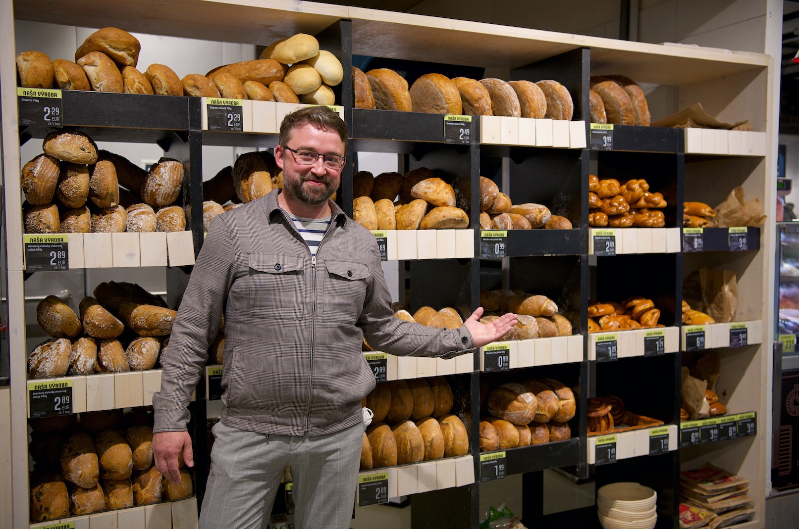 Tomu chlebu ale veľmi pridáva rozloženie supermarketu – že zákazník vidí, ako chlieb vyjde z pece priamo k zákazníkovi. Nikto iný toto nerobí na každej jednej prevádzke, sme jediní na svete.