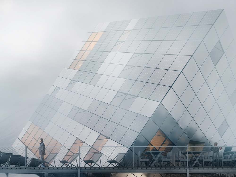Z pohľadu z diaľky ostré hrany objektu v kontexte horských štítov splývajú s kontúrami okolitých skál a prirodzene sa tak zapájajú do panorámy miesta. Vďaka zvolenému osadeniu objektu je z každého miesta vidieť tri plochy fasády.