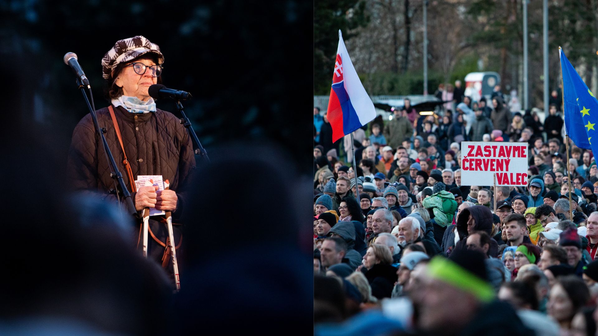 Potom na pódium prišla Anna Šišková. „Ako sa mohlo stať, že naša vláda stojí o priazeň Ruska? Bojím sa o naše Slovensko, či aj za takýchto okolností budeme súčasťou Európy. Lasica a Satinský pri Nežnej revolúcii spievali, že do batôžka si nalož lož, pretvárku a faloš a pekne zahoď všetky do studne. Spravme to aj my,“ vyzvala jedna z najvýraznejších herečiek svojej generácie.