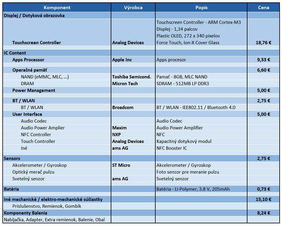 Nižšie nájdete tabuľku s cenou komponentov Apple Watch Sports: