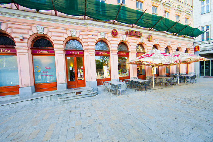 Okrem toho všetkého sa nachádza jedáleň hneď v centre mesta. V kombinácii s obrovskými oknami rovno na námestie pred Starou tržnicou si môžeš užiť naozaj dobrý obed s pozorovaním okolitého ruchu mesta. Dokonca v skorších ranných hodinách podávajú aj raňajky.