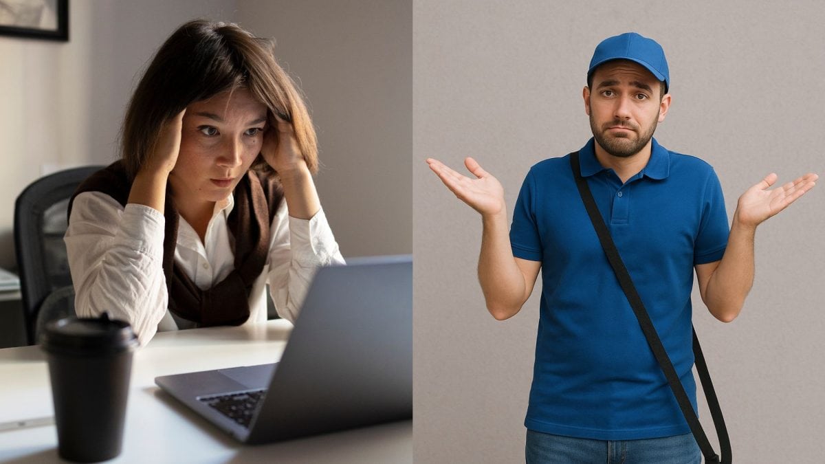 Nešťastná žena za notebookom, doručovateľ krčí plecami