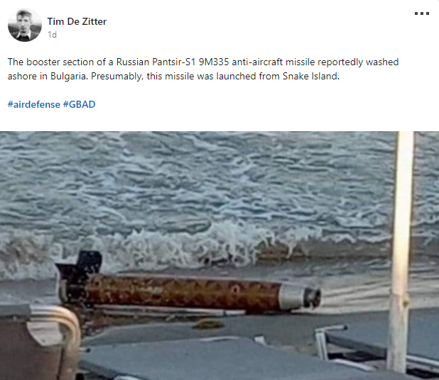 „Nosnú časť ruskej protilietadlovej rakety Pantsir-S1 9M335 údajne vyplavilo na breh Bulharska. Túto raketu pravdepodobne odpálili z Hadieho ostrova,“ uvádza na sociálnej sieti LinkedIn Tim De Zitter, obranný generál a systémový manažér na belgickom ministerstve obrany.