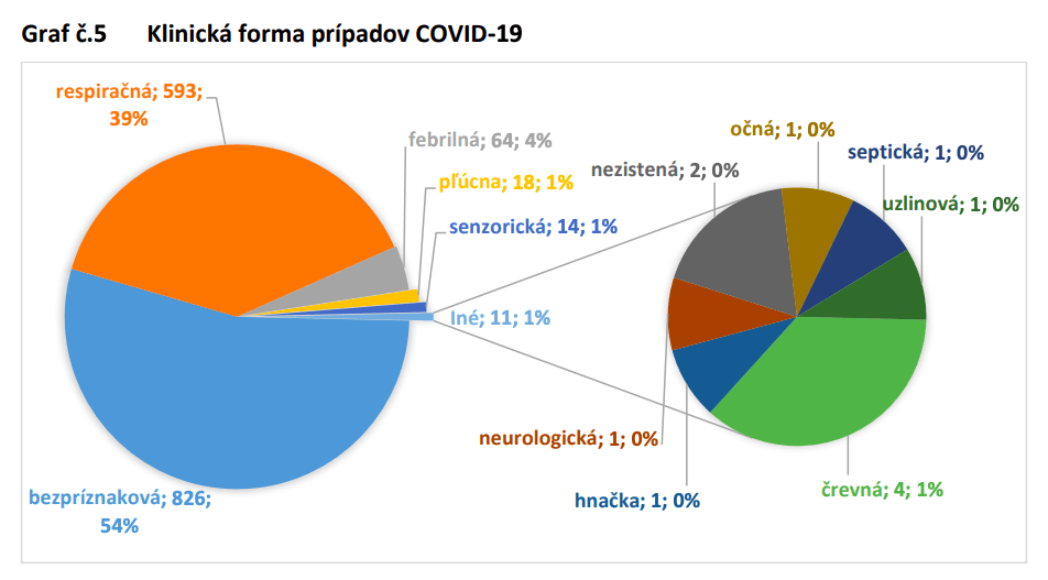 Čo sa týka veku, najviac prípadov koronavírusu je medzi mladšími ľuďmi od 15 do 34 rokov. Viac ako polovica prípadov (54%) bola bezpríznaková. 39 percent malo respiračnú formu, zvyšok mal febrilnú (miernu) alebo inú (črevnú, senzorickú a pod.) formu.