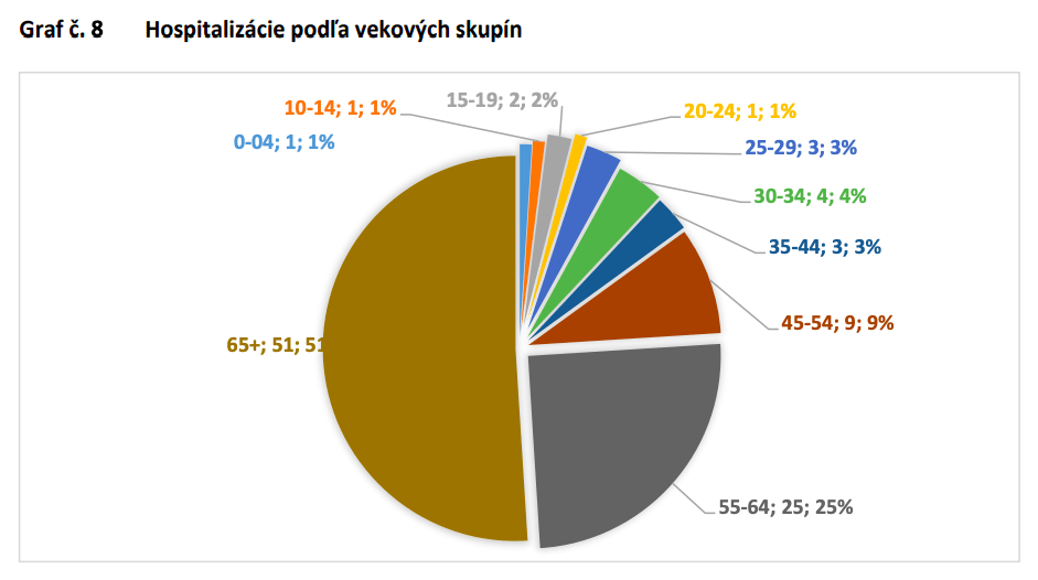 Hoci je podiel starších pacientov s koronavírusom pomerne nízky, ide o rizikovú skupinu, u ktorej ochorenie COVID-19 môže prebiehať ťažšie. Pacienti už nad 50 rokov často vyžadujú hospitalizáciu. V auguste bolo hospitalizovaných 100 pacientov, z toho bolo 51 vo vekovej skupine nad 65 rokov. 25 pacientov bolo v skupine 55-64 rokov.