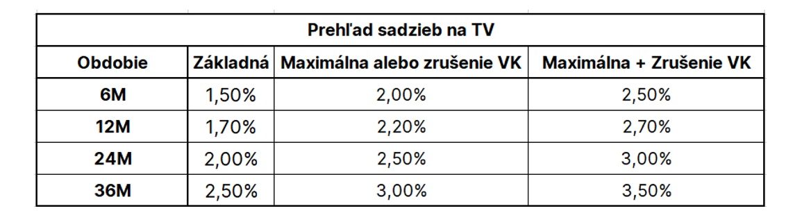 Pri 36-mesačnom TV sa ale základná sadzba nachádza na úrovni 2,5 % ročne a maximálna na 3 % ročne.