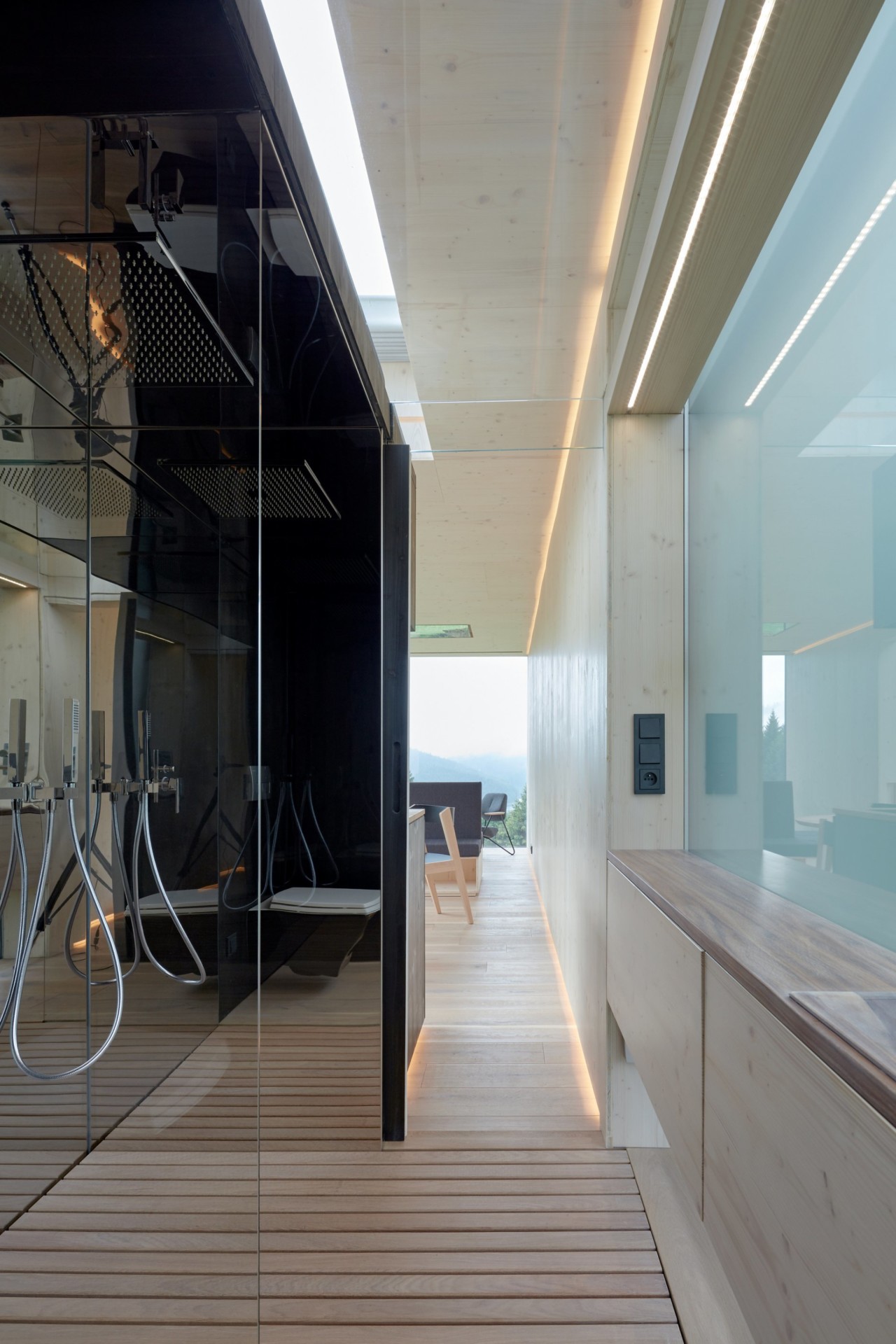 Zadná strana boxu je sprchou a toaletou. vysunutím dverí z rohov boxu sa priestor štrbiny uzatvorí do kúpeľne, ktorá je presvetlená cez mliečne sklo (ktoré zároveň tvorí obvodovú stenu).
