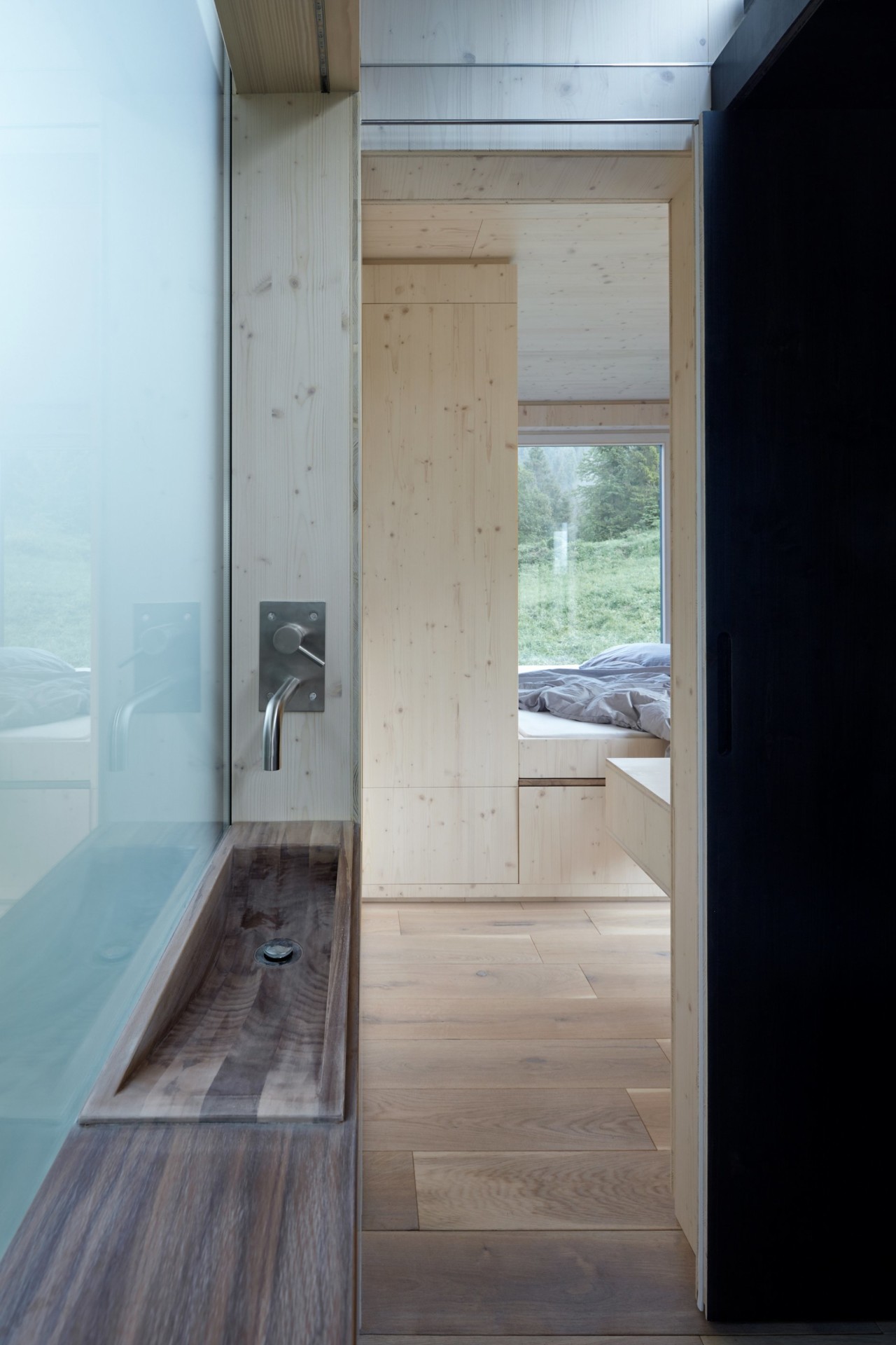 Otvory vo všetkých piatich fasádach, „rámujú“ pohľady ako scénické hry prírody a premietajú ich do interiéru. Či už ide o otváravú stenu, ktorá fyzicky vpúšťa prírodu do interiéru, predné vykonzolované zasklenie, či kúpeľnovú stenu s mliečnym sklom, na ktorej sa odohráva tieňohra dotýkajúcich sa konárov a meniacich sa siluét lesa. Azda najzaujímavejšie je horizontálne presklenie skyboxu, v ktorom máte pri zaspávaní pocit, že ste vonku pod holým nebom.