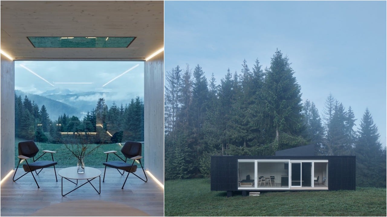 Otvory vo všetkých piatich fasádach, „rámujú“ pohľady ako scénické hry prírody a premietajú ich do interiéru. Či už ide o otváravú stenu, ktorá fyzicky vpúšťa prírodu do interiéru, predné vykonzolované zasklenie, či kúpeľnovú stenu s mliečnym sklom, na ktorej sa odohráva tieňohra dotýkajúcich sa konárov a meniacich sa siluét lesa. Azda najzaujímavejšie je horizontálne presklenie skyboxu, v ktorom máte pri zaspávaní pocit, že ste vonku pod holým nebom.
