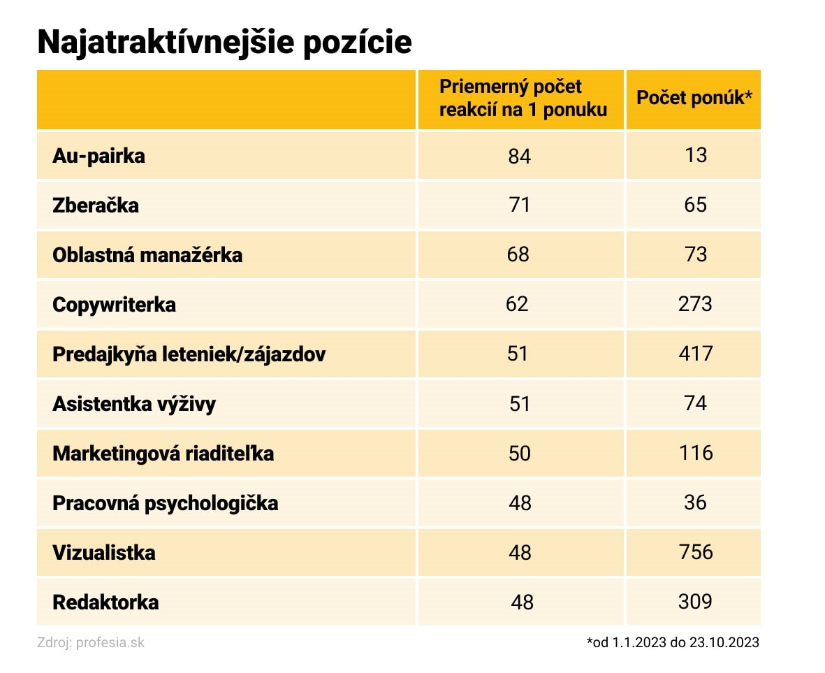 Existujú aj iné pozície, ktoré majú vysoký záujem, ako napríklad predavačky, administratívne pracovníčky a pokladníčky, pričom priemerný počet reakcií presahuje 28 na viac ako 22 000 inzerátov.