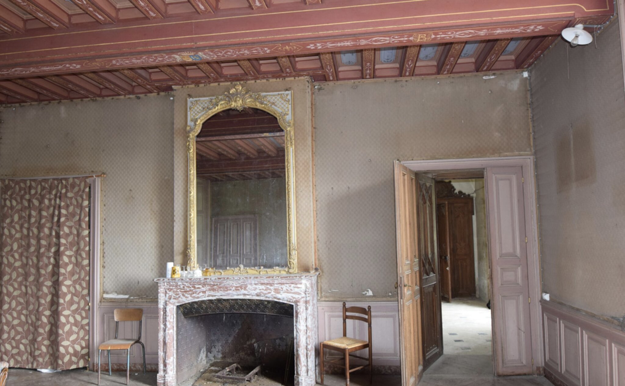 Vo vnútri zámku sa nachádza vstupná hala s vyrezávaným schodiskom – jeden z najvýraznejších prvkov interiéru. Drevo, ktoré roky bez pohybu žilo vo vlhkom vzduchu francúzskeho vidieka, si aj dnes zachováva výraznú kresbu.