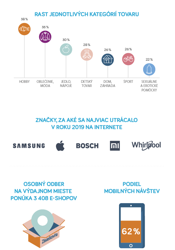 Oddelením s jednoznačne najsilnejším objemom predaja za rok 2019 je Elektronika, ktorá tvorí dve pätiny všetkých objednávok. Do tejto kategórie spadá biela aj čierna technika, najpopulárnejšie sú technologické vychytávky ako robotické vysávače, inteligentné hodinky, telefóny či televízory a herné konzoly. Značkou roka, za ktorú sa na slovenských e-shopoch utrácalo najviac, sa stal juhokórejský gigant Samsung, druhou najobľúbenejšou značkou bol Apple a treťou Bosch.