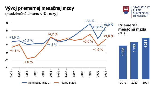 - Napriek vyššej inflácii sa podľa údajov Štatistického úradu SR zvýšil aj reálny rast miezd, za celý rok 2021 boli mzdy reálne vyššie o 3,6 %